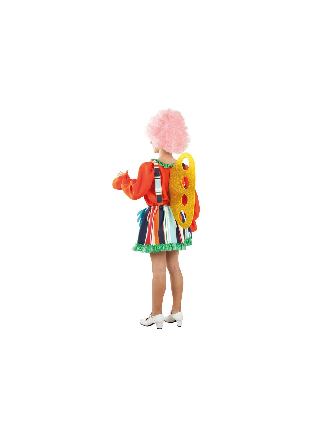 Disfraz de muñequita de cuerda para niña con el que disfrutará de cualquier celebración. Compuesto por una camiseta monocolor con el cuello con detalles verdes y una llave de ogma eva en la parte trasera, y falda a juego con rayas multicolores.