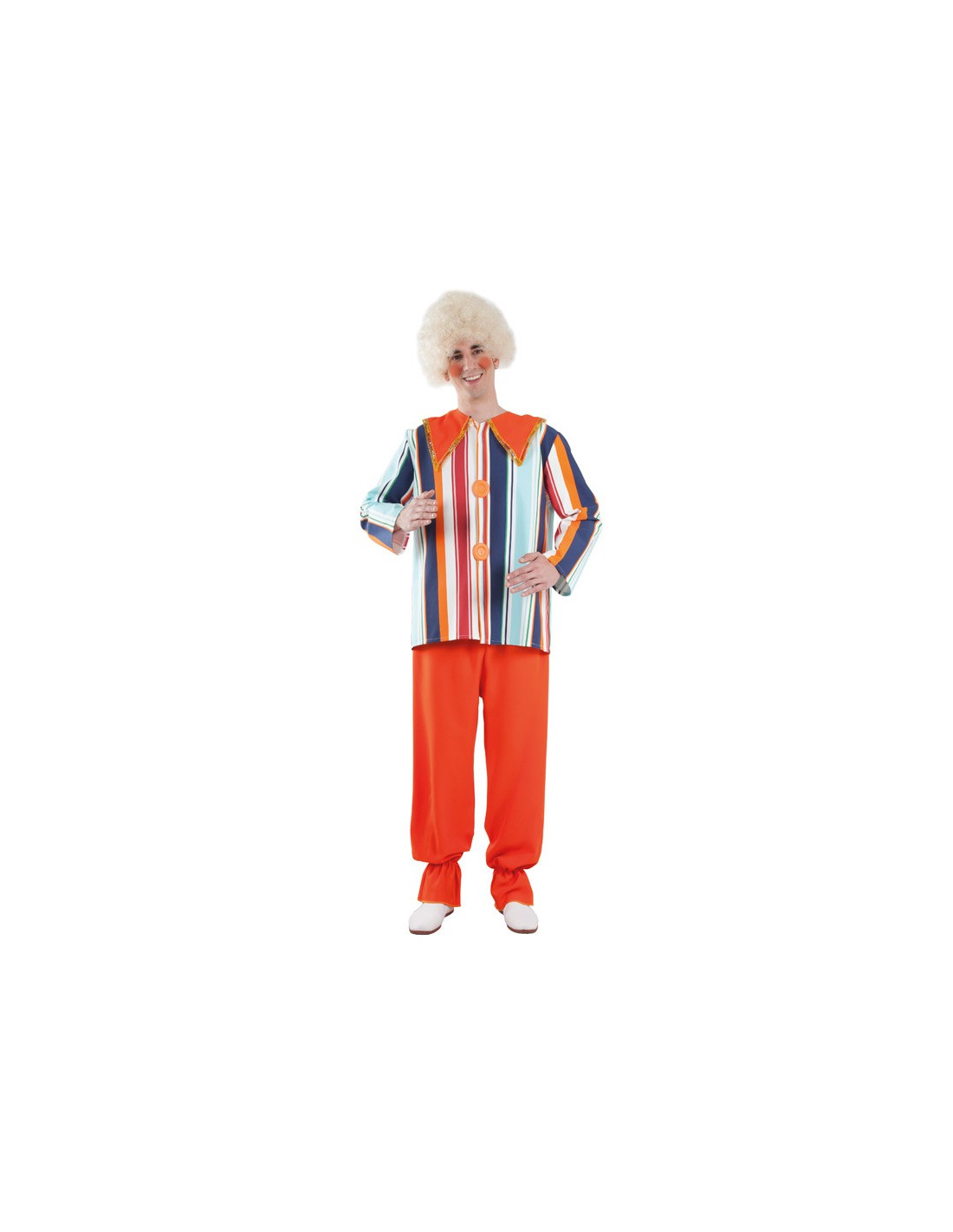 Traje de muñeco de cuerda para adulto con el que podrá ser uno de los personajes de cuento más famosos. Compuesto por una camiseta de rayas multicolores con una llave de cuerda fabricada en goma eva en la parte posterior, y un pantalón monocolor.