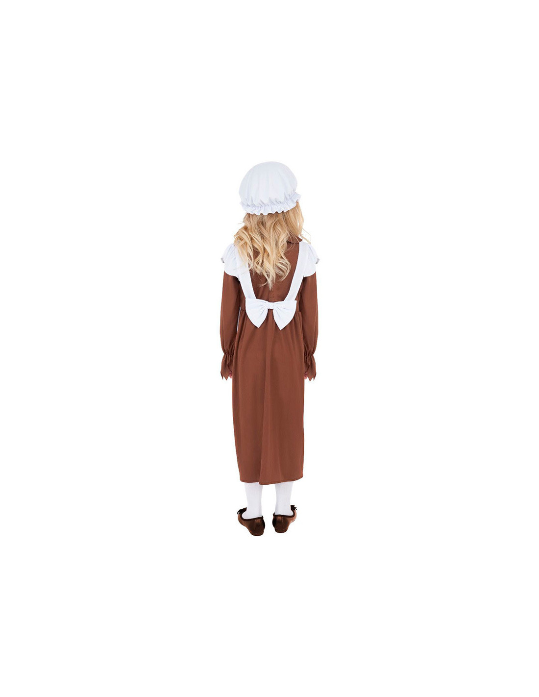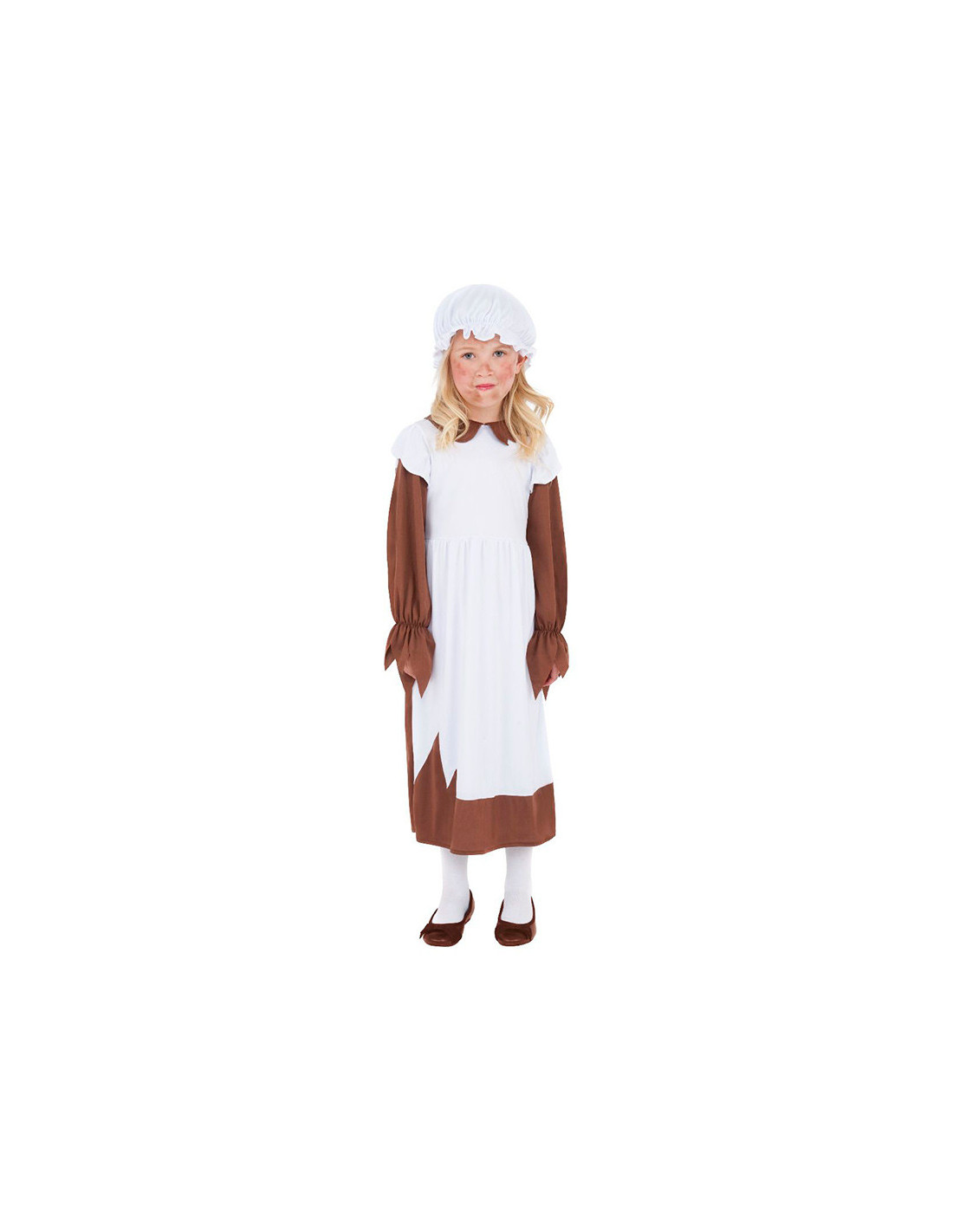 El disfraz de niña pobre victoriana contiene un vestido de manga larga marrón con mandil blanco integrado y sombrero blanco.