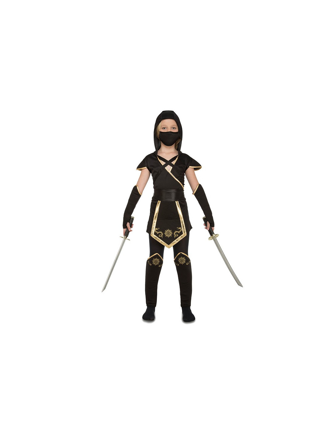 Este disfraz de Ninja para niña contiene un vestido con capucha, cinturón, cubrebotas, máscara y manguitos. Todo ello en color negro y oro.