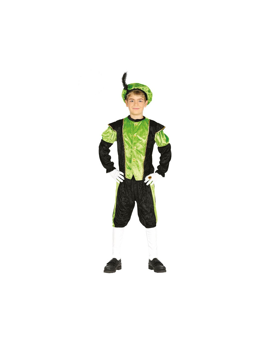Disfraz de paje verde infantil que incluye gorra, casaca y pantalón.