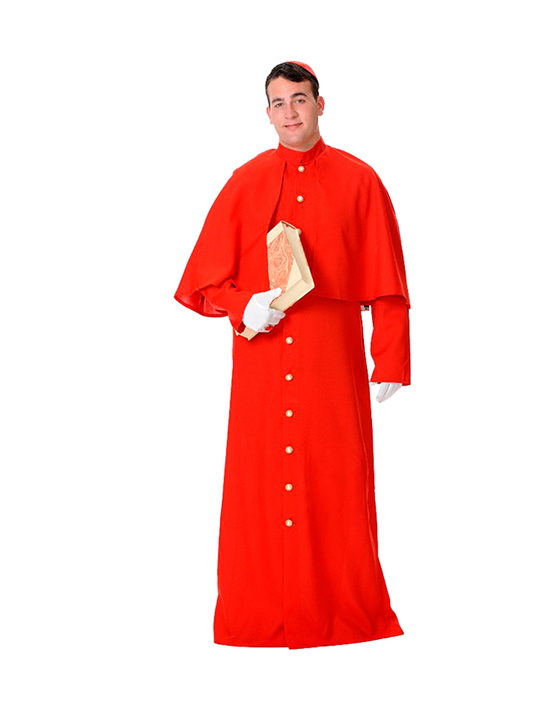 Traje de Papa, disponible en color blanco y rojo, que incluye bonete y túnica con capelina. No incluye guantes, cruz ni anillos.