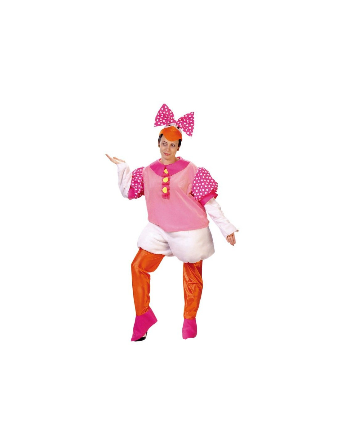 Disfraz de patita adulto, que incluye: Cabeza con lazo grande rosa, mono con la camisa rosa y pantalón blanco y patas naranjas con los pies rosas.