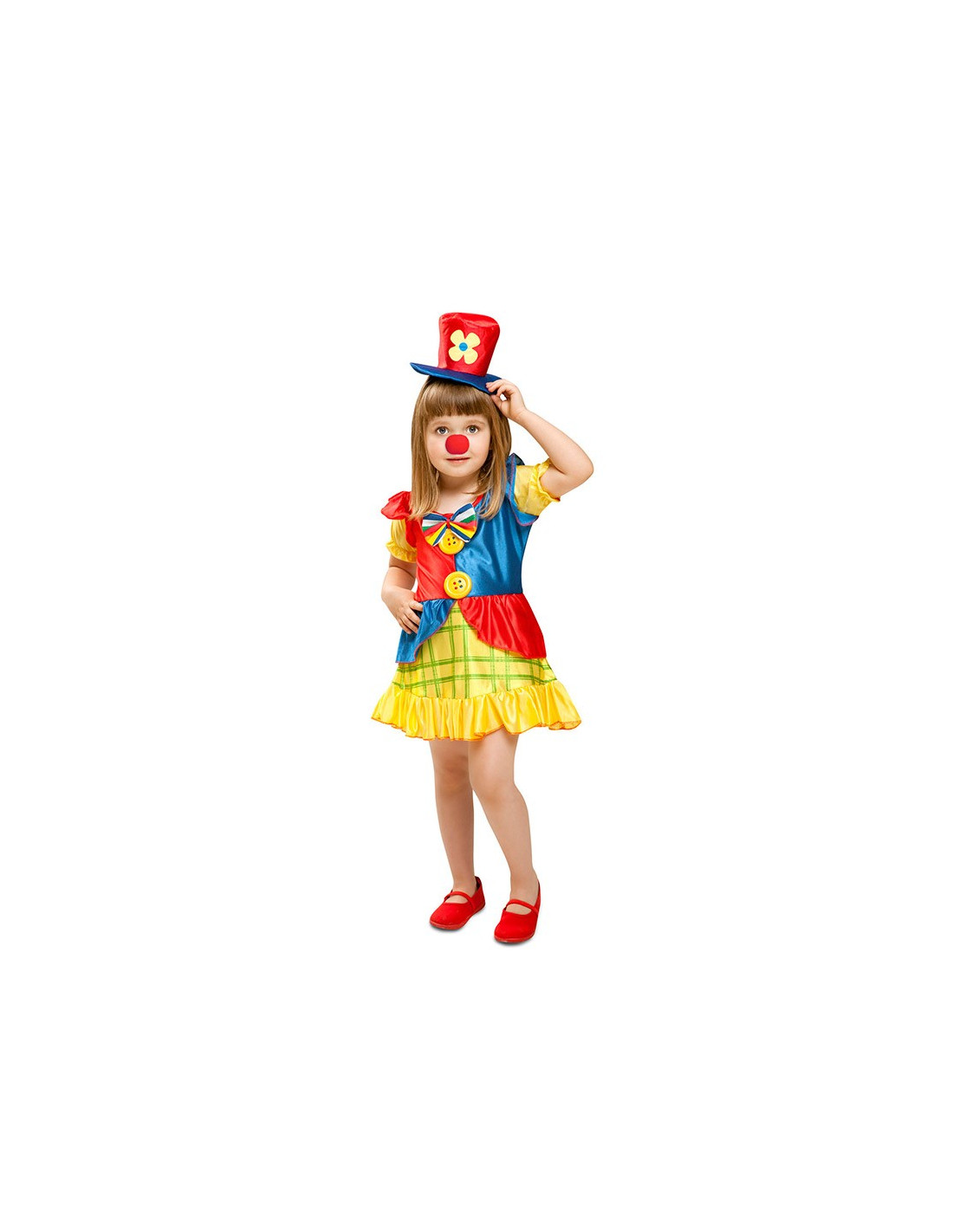 Disfraz de payasita divertida para niña que incluye vestido, chistera roja y azul con una flor y pajarita multicolor.