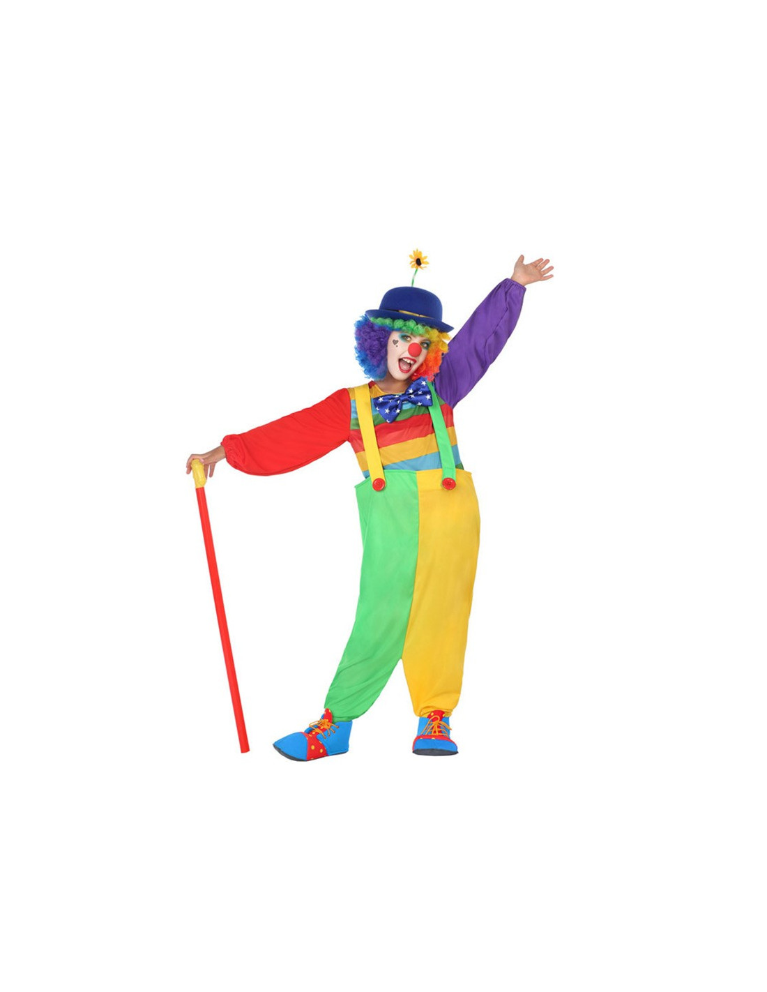 El disfraz de payasita iris contiene camiseta de manga larga, peto de tiro bajo y pajarita azul con estrellas.