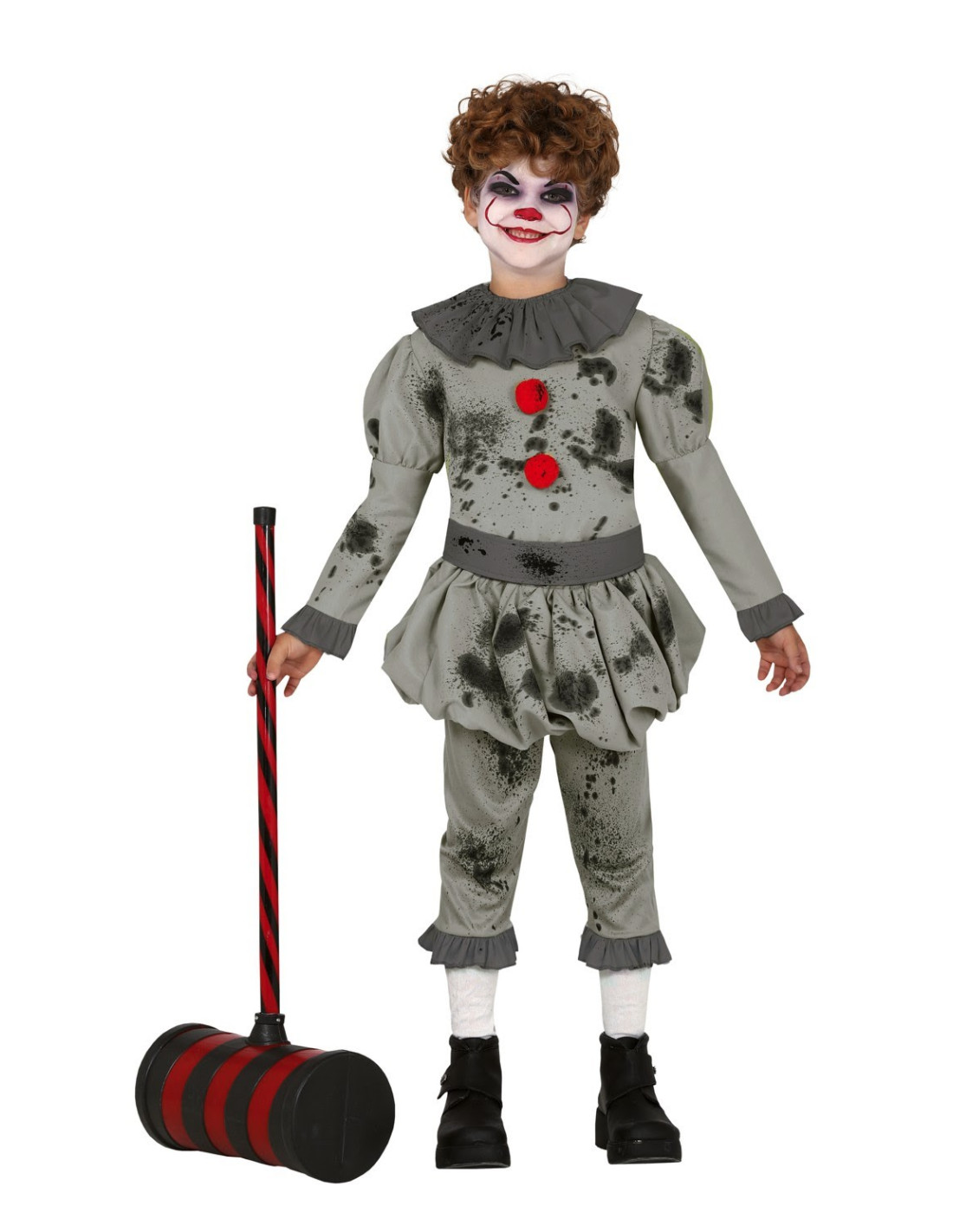 Disfraz de payaso asesino niño para Halloween. Emula al famoso payaso del cine con este traje de estilo antiguo y desgastado. Acompáñalo de impactante maquillaje para estar irreconocible.