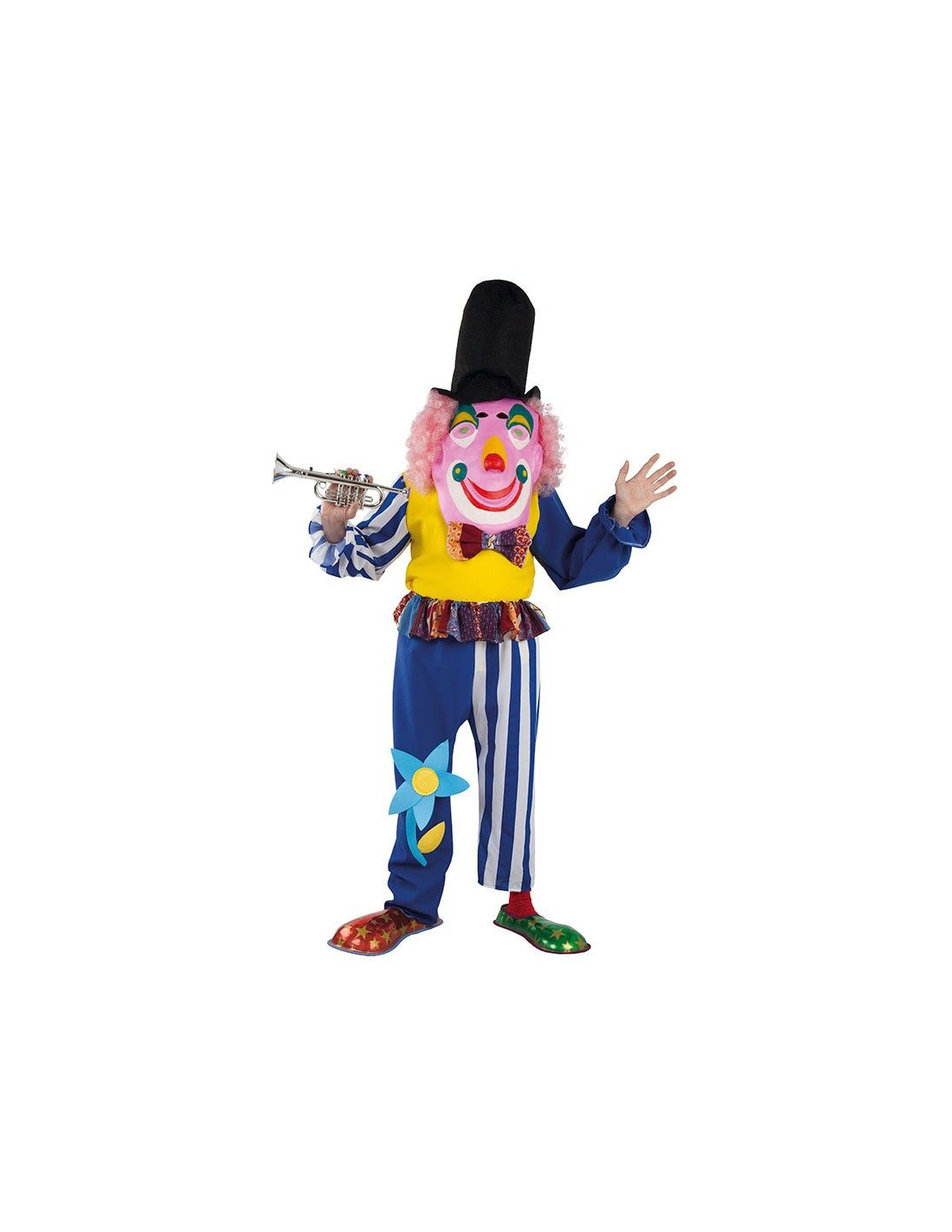Disfraz de payaso cabezón que incluye gorro negro estilo sombrero de copa alta, con pelo rosa simulando una peluca, careta en tono rosa y con detalles multicolores, camiseta con lazo decorativo en la parte frontal y pantalón en tonos azules con una flor de fieltro. No incluye trompeta ni zapatones.