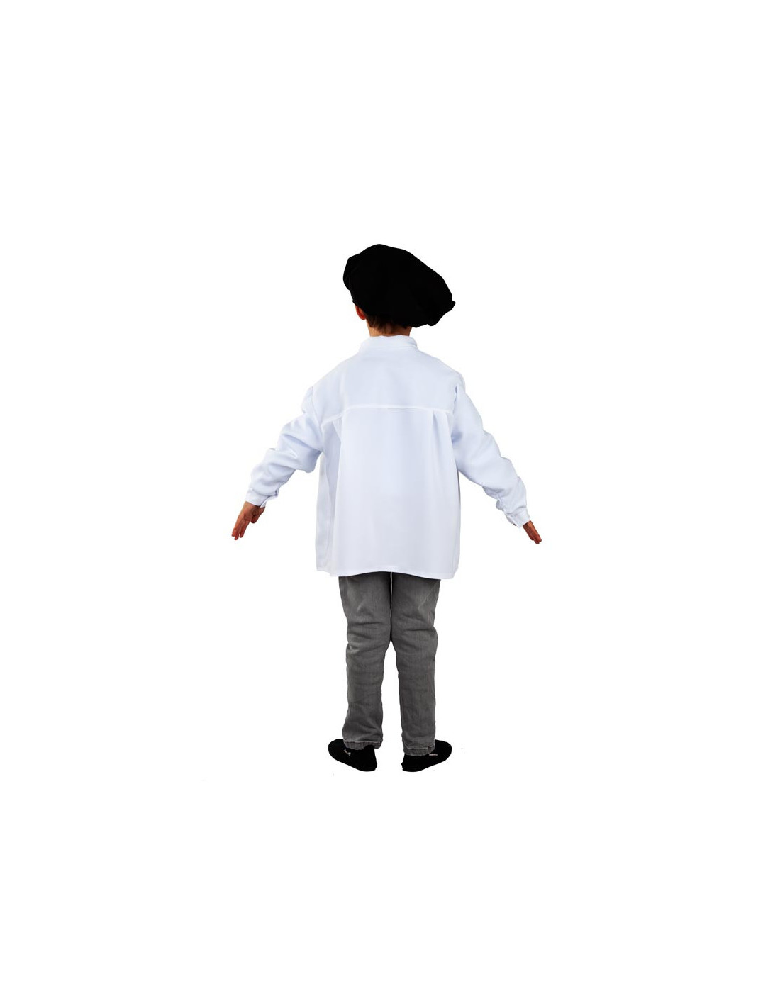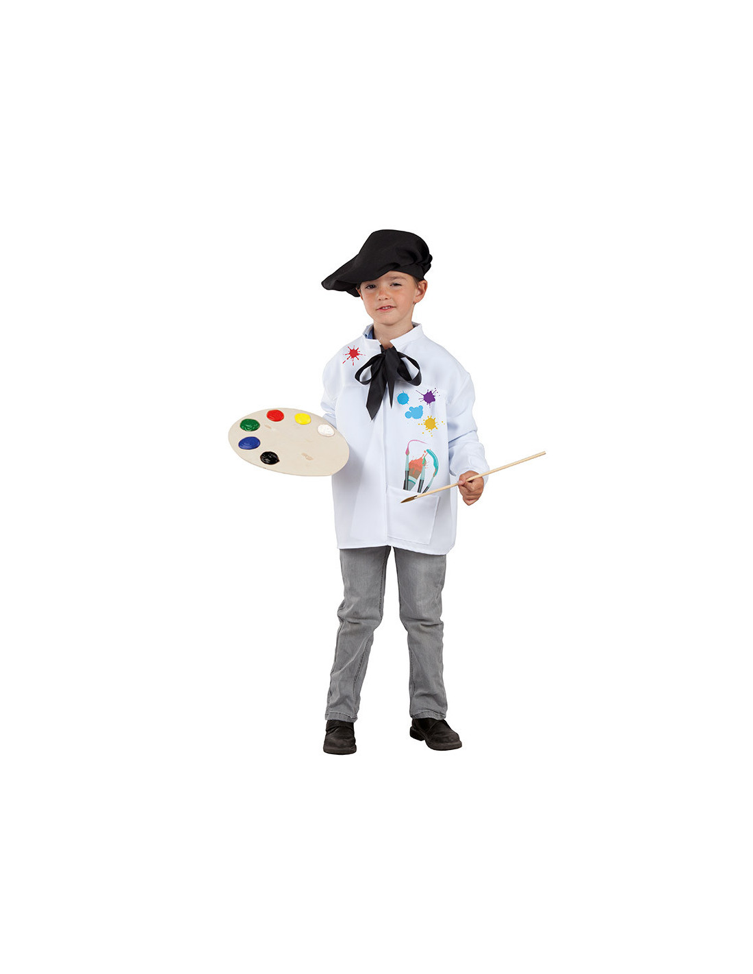 El disfraz de Pintor infantil contiene un blusón blanco estampado, lazo negro y gorra negra.