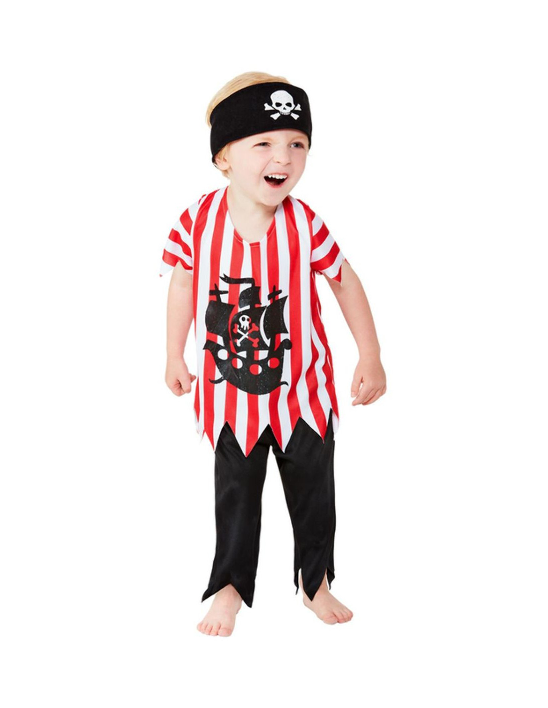 El disfraz de pirata bebé contiene una camiseta a rayas de manga corta, pantalón negro y pañuelo para la cabeza con una calavera.