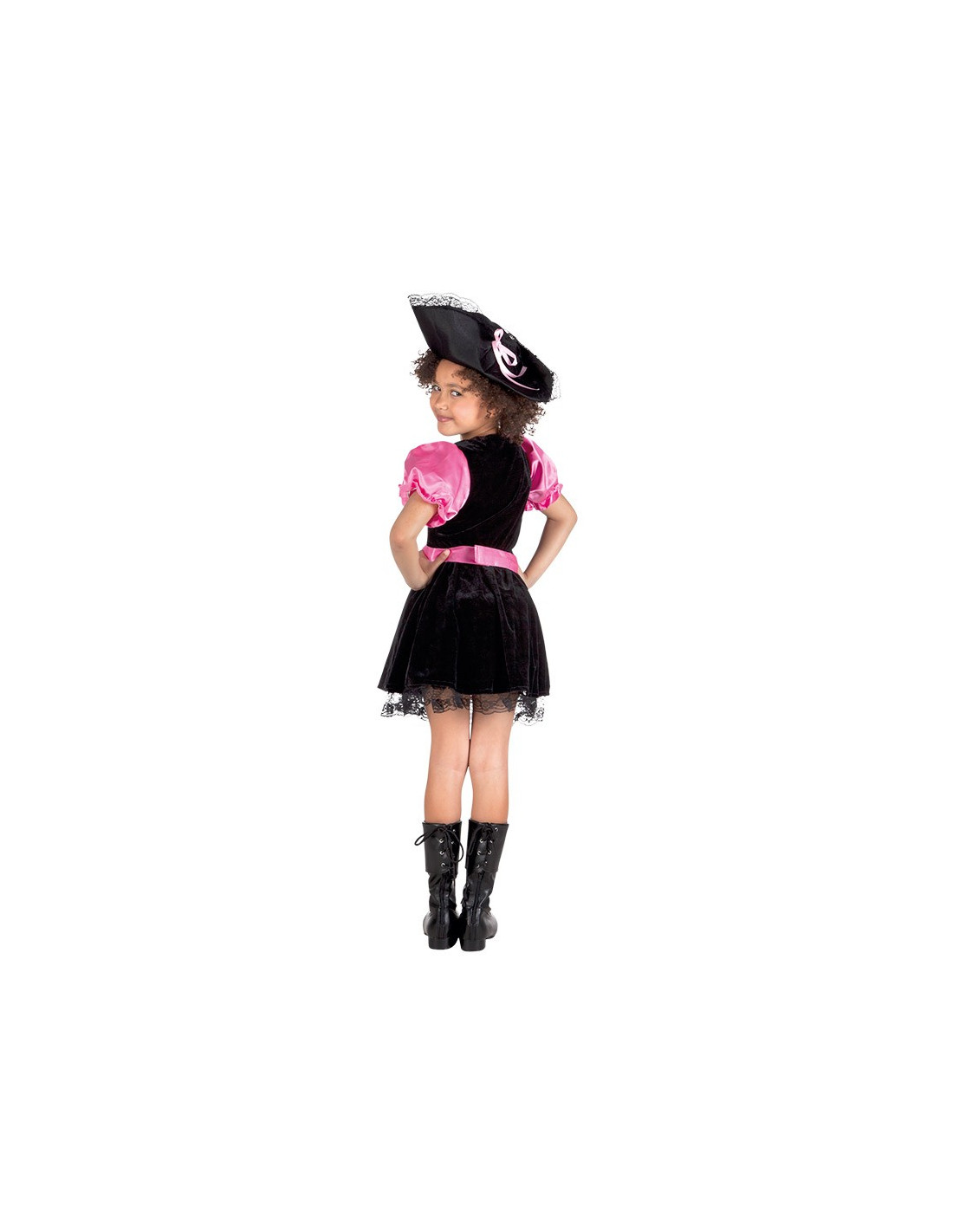 Este disfraz de pirata pink para niña está compuesto por un sombrero negro con lazos rosas y puntilla negra, un cinturón rosa y un precioso vestido negro con las mangas rosas. En el pecho tiene una lazada rosa y en la falda una calavera blanca estampada.