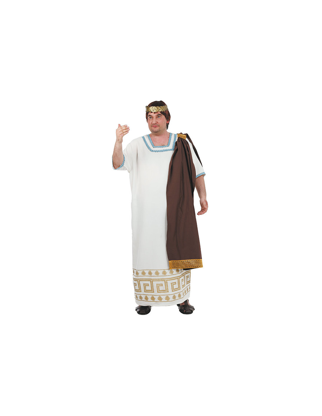¡Ave, César! Reparte justicia en tus mejores fiestas con este disfraz de Pretor romano para hombre. Compuesto por túnica blanca de strech con serigrafiado en la parte baja con una greca en color oro. También incluye una estola de color marrón con detalles de color oro.