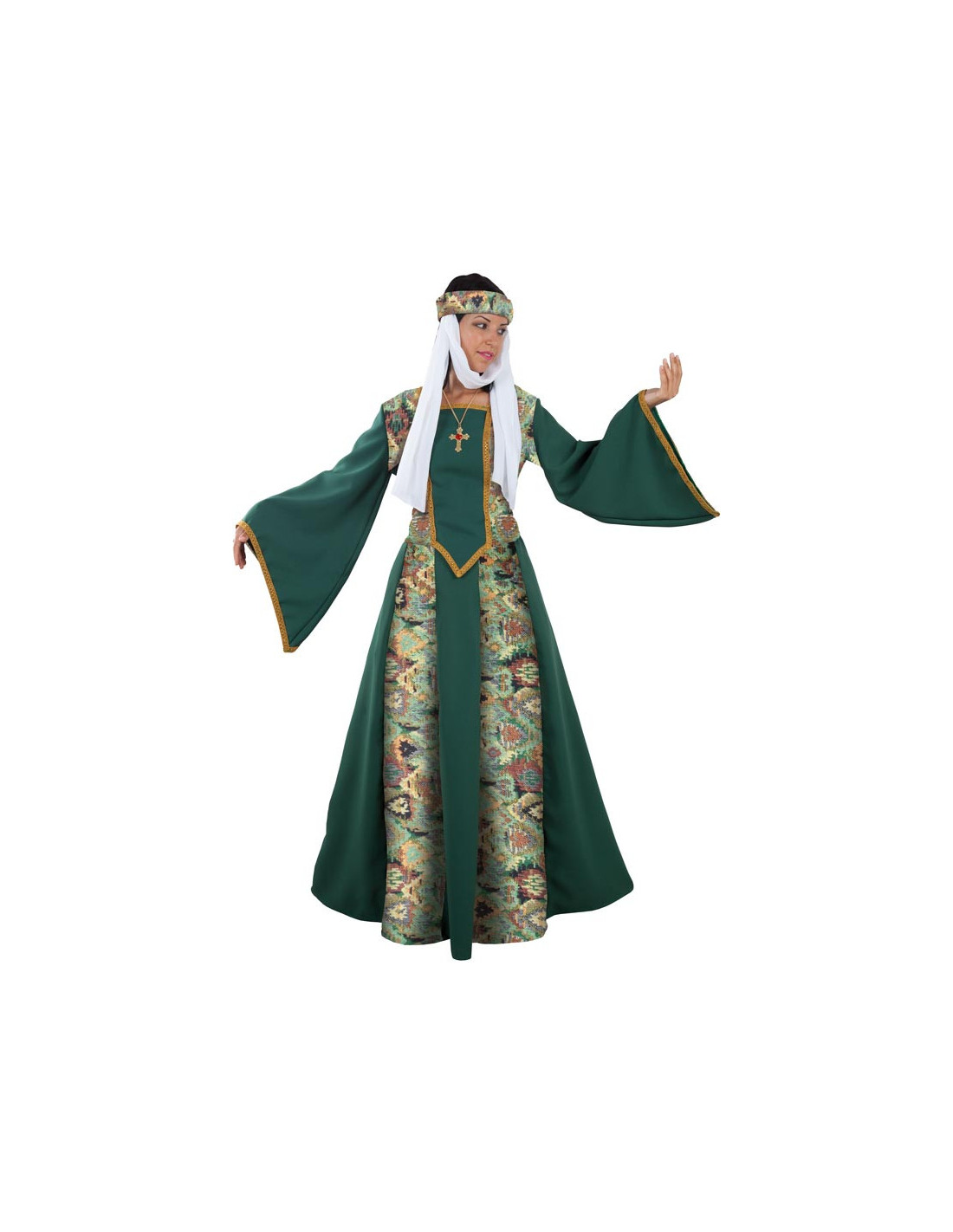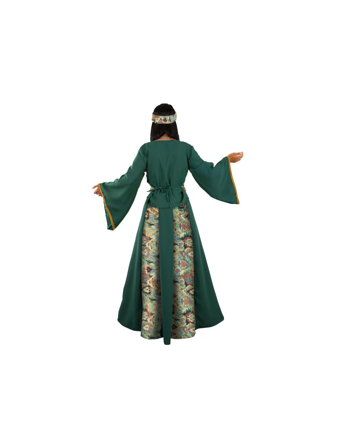 Pasea entre los maravillosos jardines de la Edad Media con este espectacular disfraz de princesa medieval para mujer. Compuesto por un tocado verde con estampado de flores y velo para la parte de la cara (como luce el personaje de Olenna Redwyne, la archifamosa reina Tyrell y Altojardín en Juego de Tronos), y un vestido de dos piezas compuesto por una camisa verde con las mangas acampanadas y una falda larga en los mismos colores y con estampado de flores siguiendo el diseño del tocado.