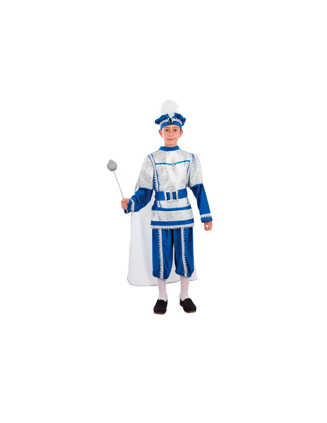 Este disfraz de Príncipe azul niño contiene una casaca con capa, pantalón, gorra y cinturón; todo ello en tonos azul y plata.