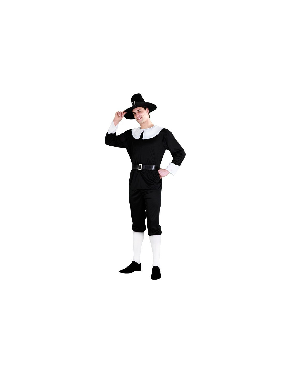 Disfraz de puritano que incluye sombrero, camisa, pantalón y cinturón.