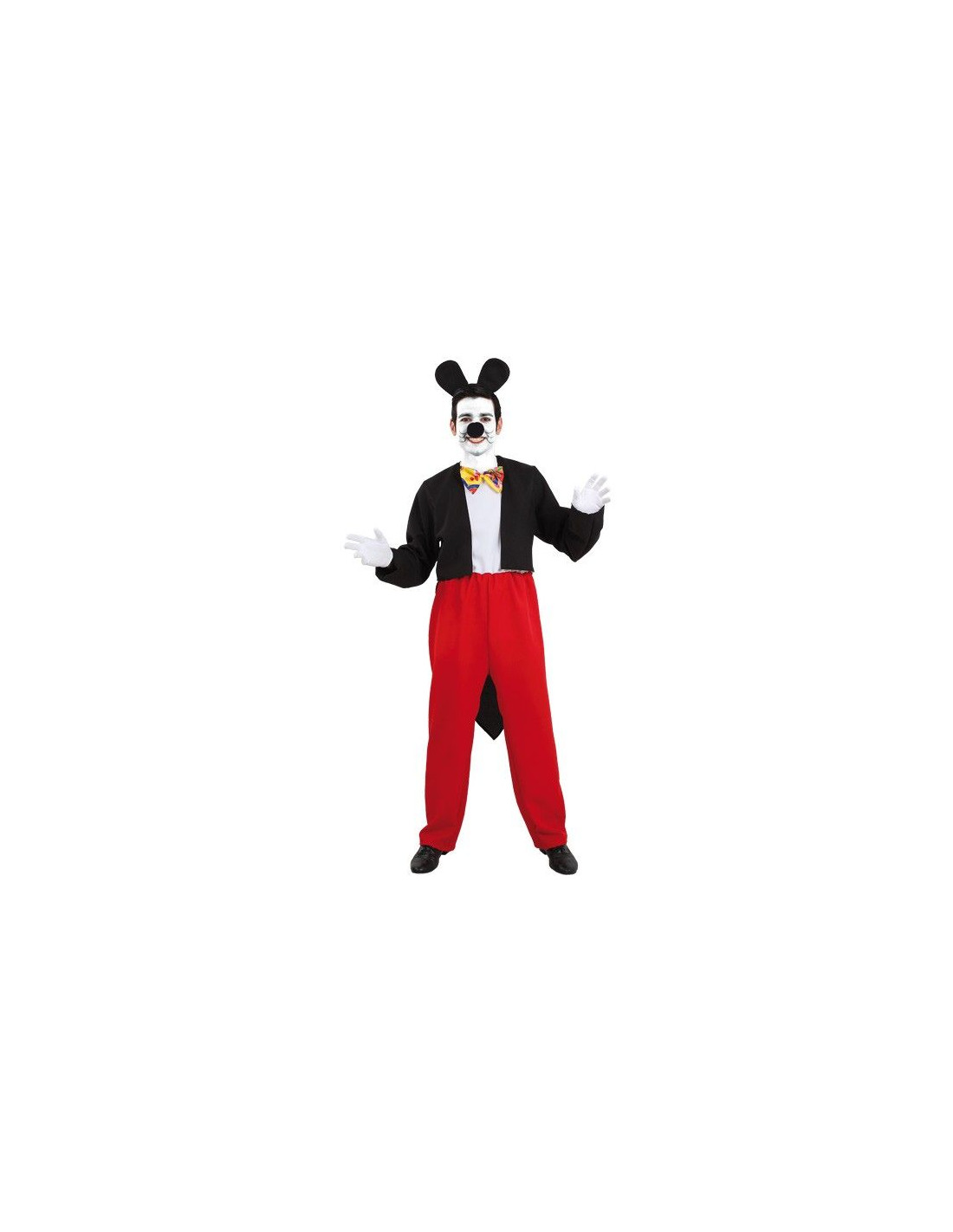 Disfraz raton Mickey hombre, incluye diadema con orejas, chaqueta tipo frac, pechero blanco con pajarita de colores y pantalon rojo.
