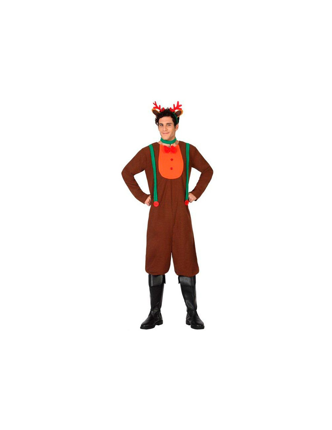 El disfraz de reno para hombre contiene un mono marrón con pajarita y tirantes, collar verde y una diadema con orejitas y cuernos.