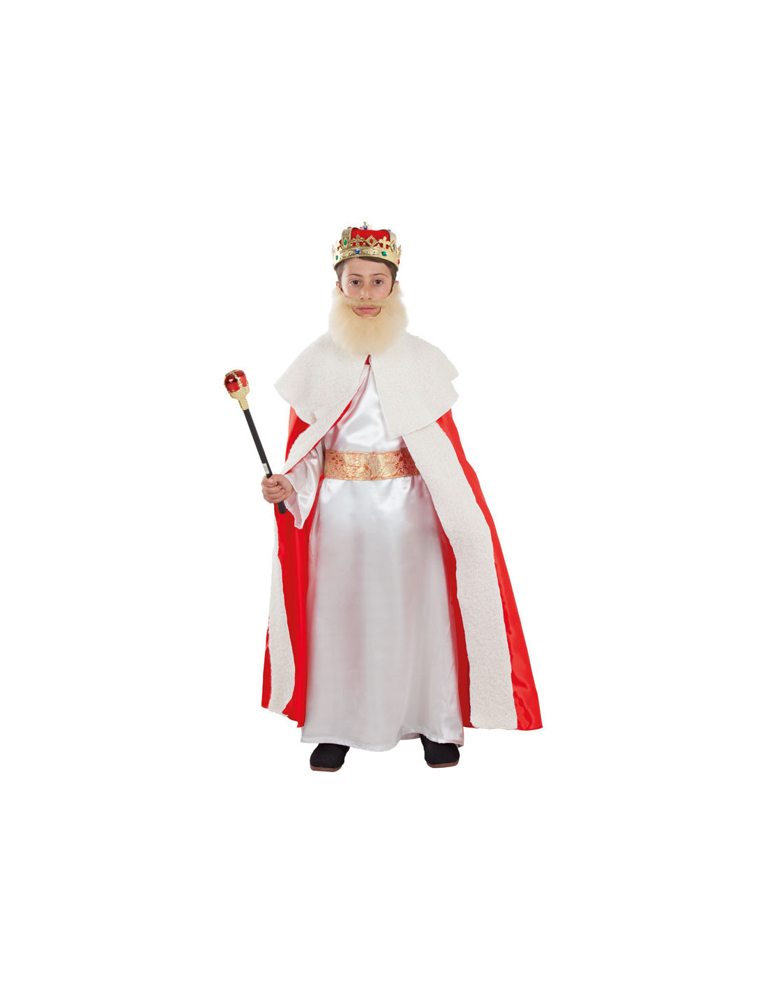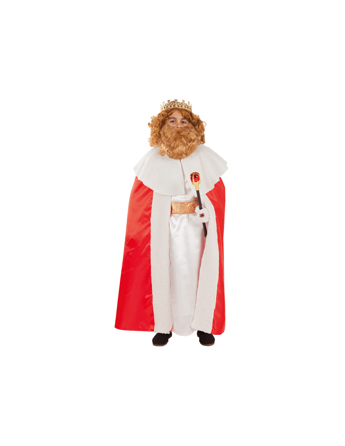 El disfraz de Rey Mago Gaspar infantil contiene capa roja con capelina blanca , cinturón y túnica blanca.
