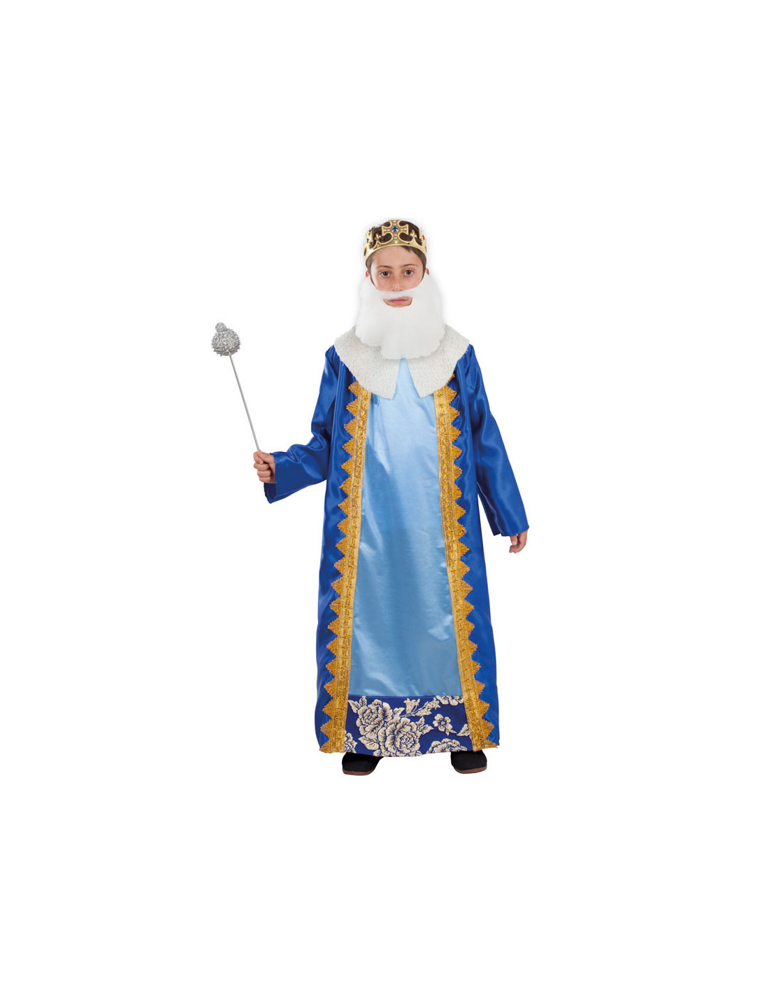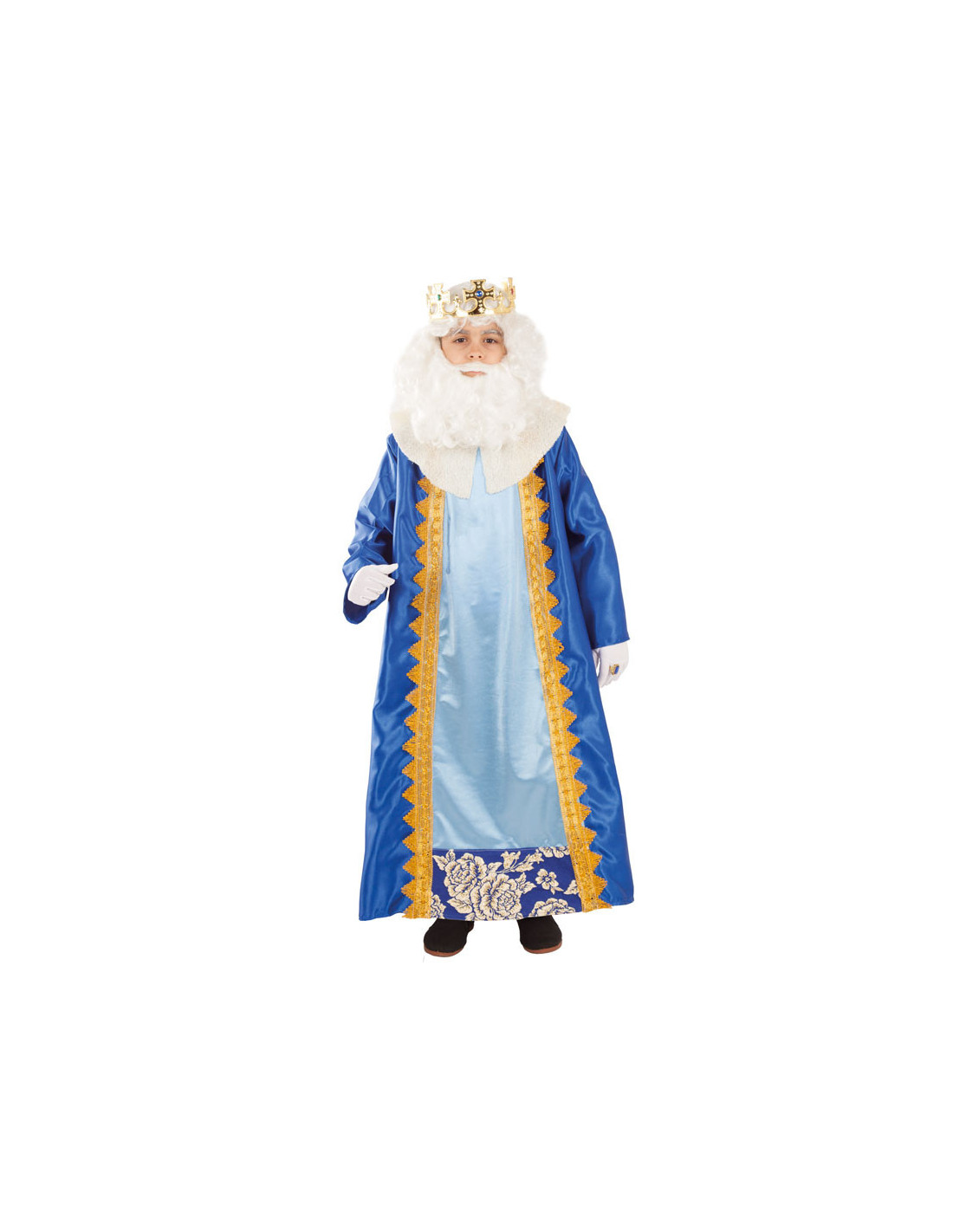Este completo disfraz de Rey Mago Melchor infantil que contiene túnica azul en dos tonalidades con capelina blanca.