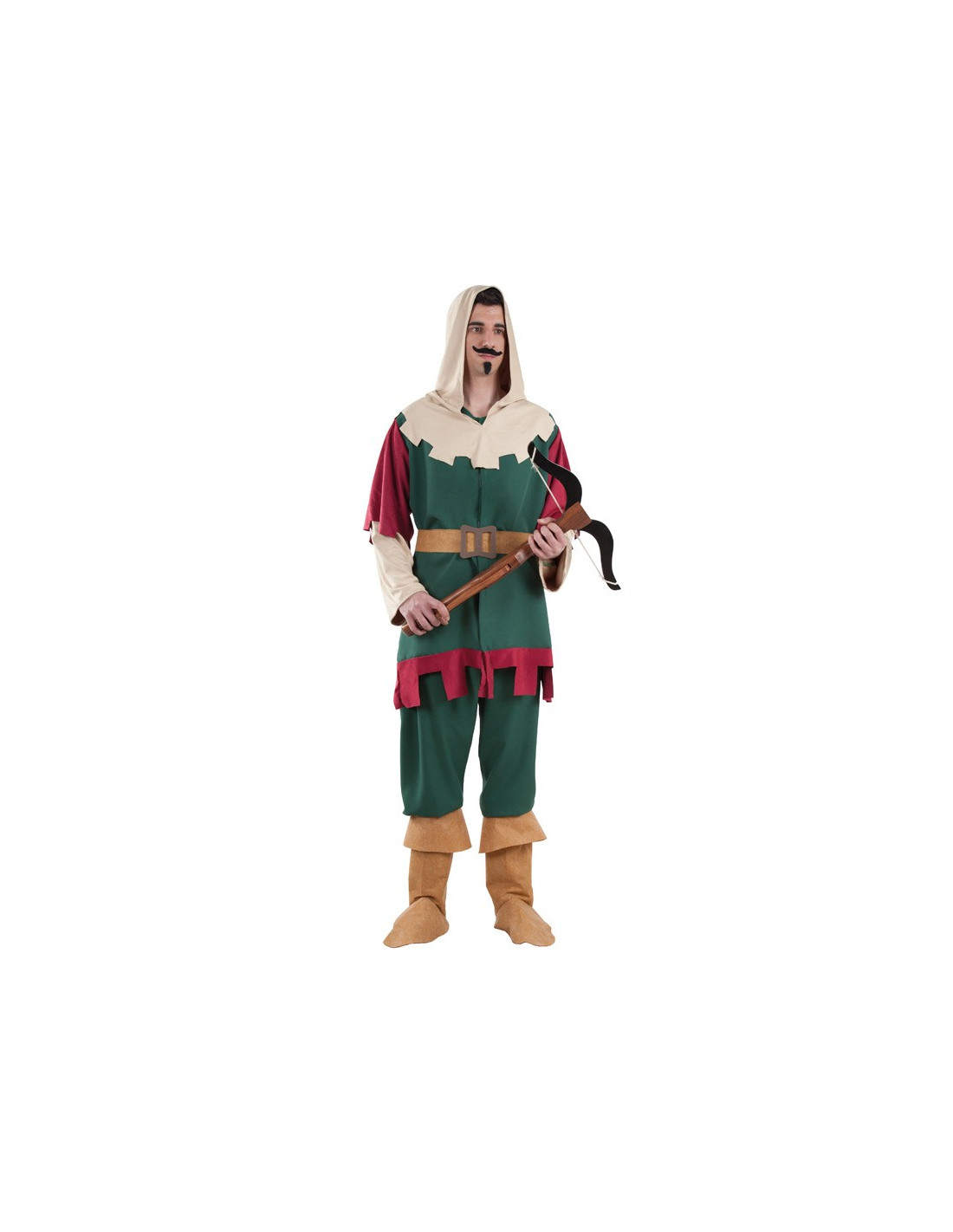 Disfraz de Robin Hood para hombre que incluye capucha, casaca, cinturón, pantalón y cubrebotas. No incluye ballesta.