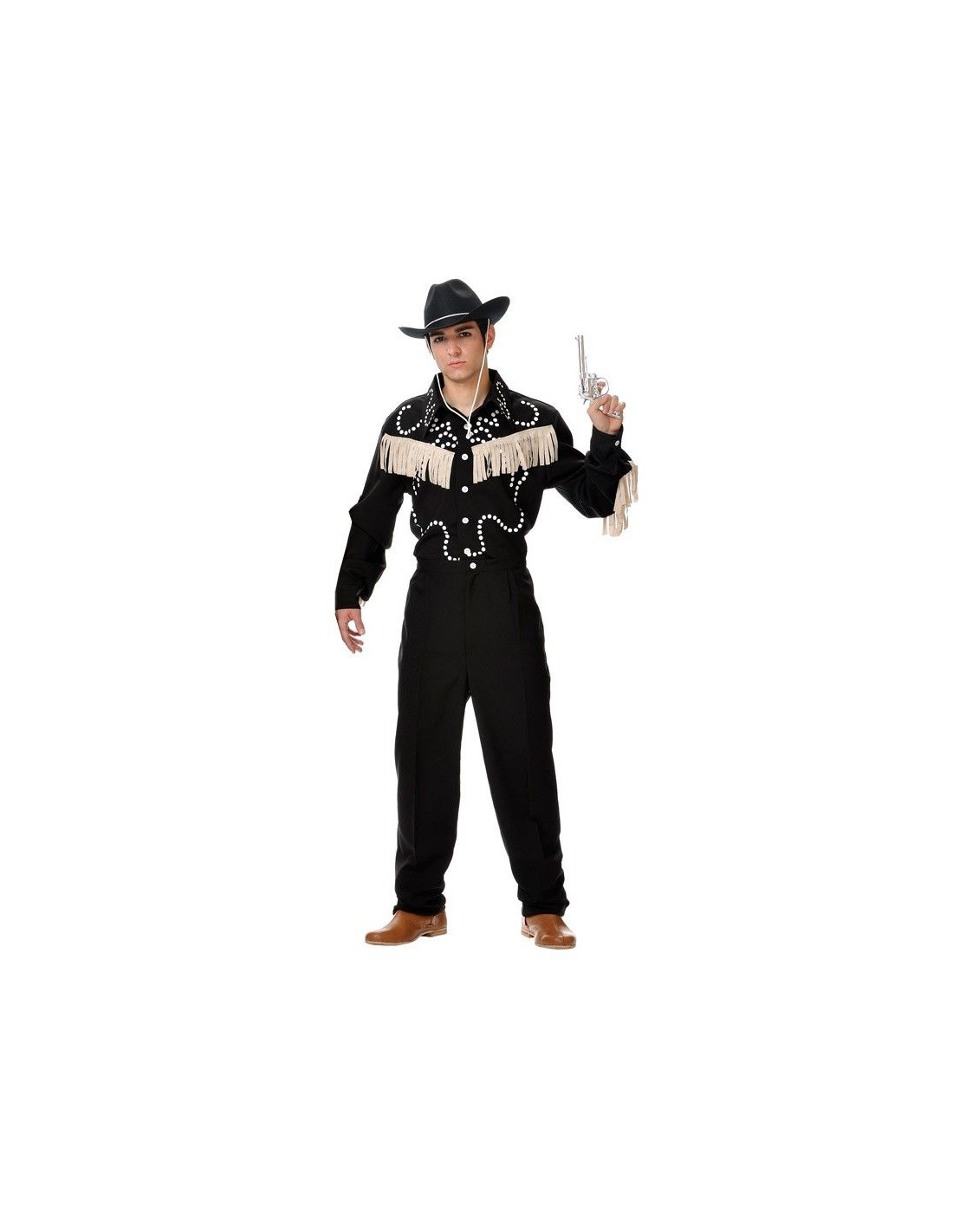 Disfraz de Vaquero de Rodeo compuesto por camisa negra de strech negro, decorada con flecos beig en las magas y en el canesu, tambien esta decorado con una estampacion de puntos en la parte delantera y pantalon negro de strech.