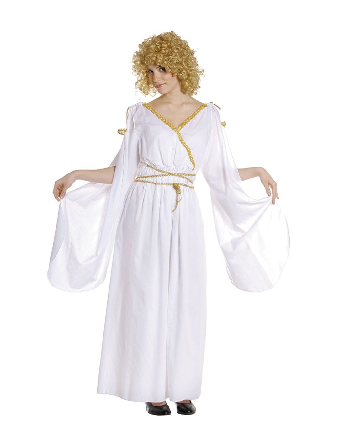 Disfraz de Romana que incluye vestido blanco de tejido de strech decorado en las mangas con pasamanería color oro o plata.