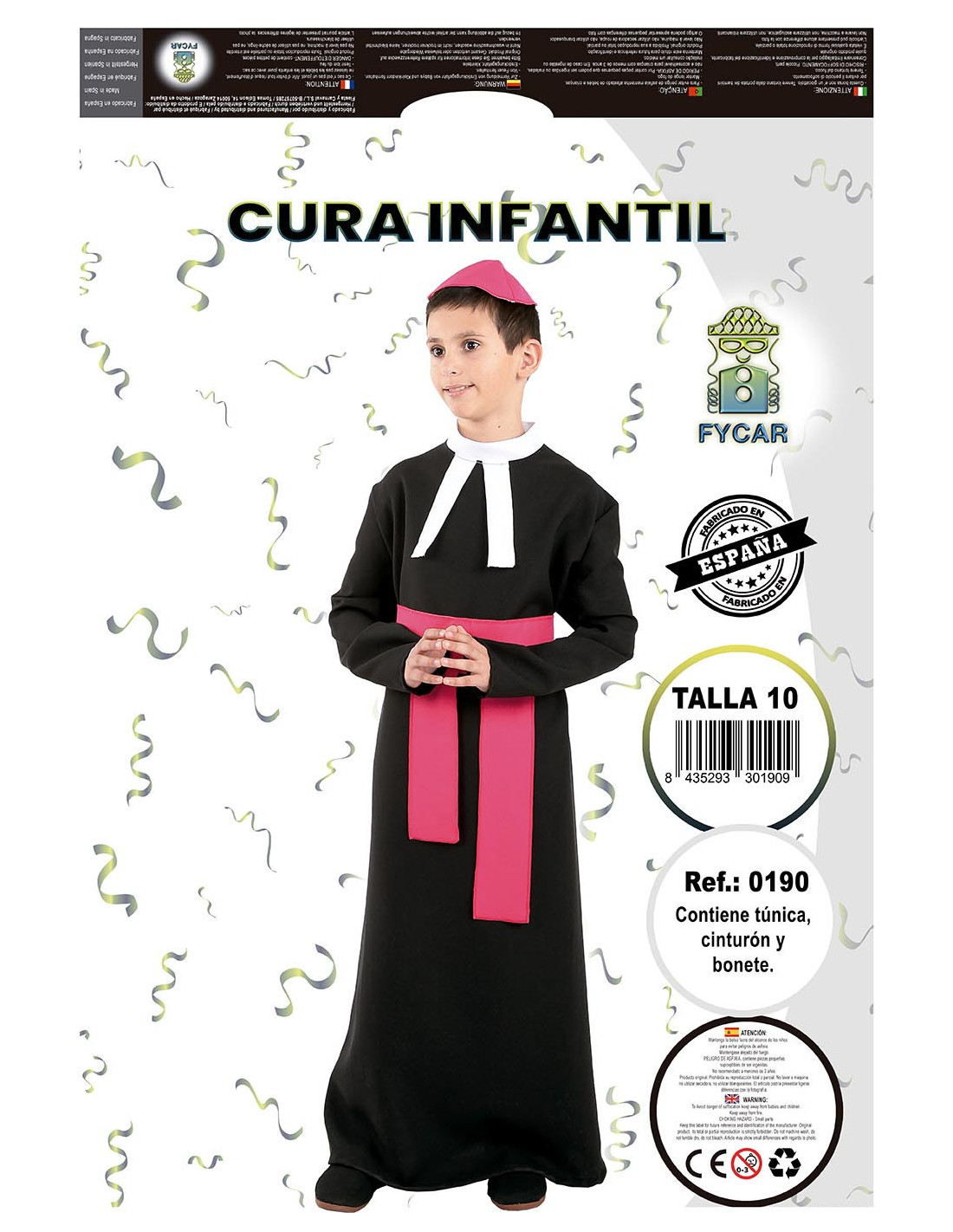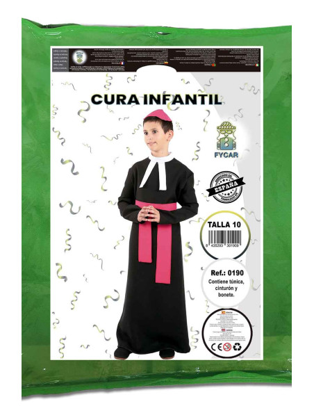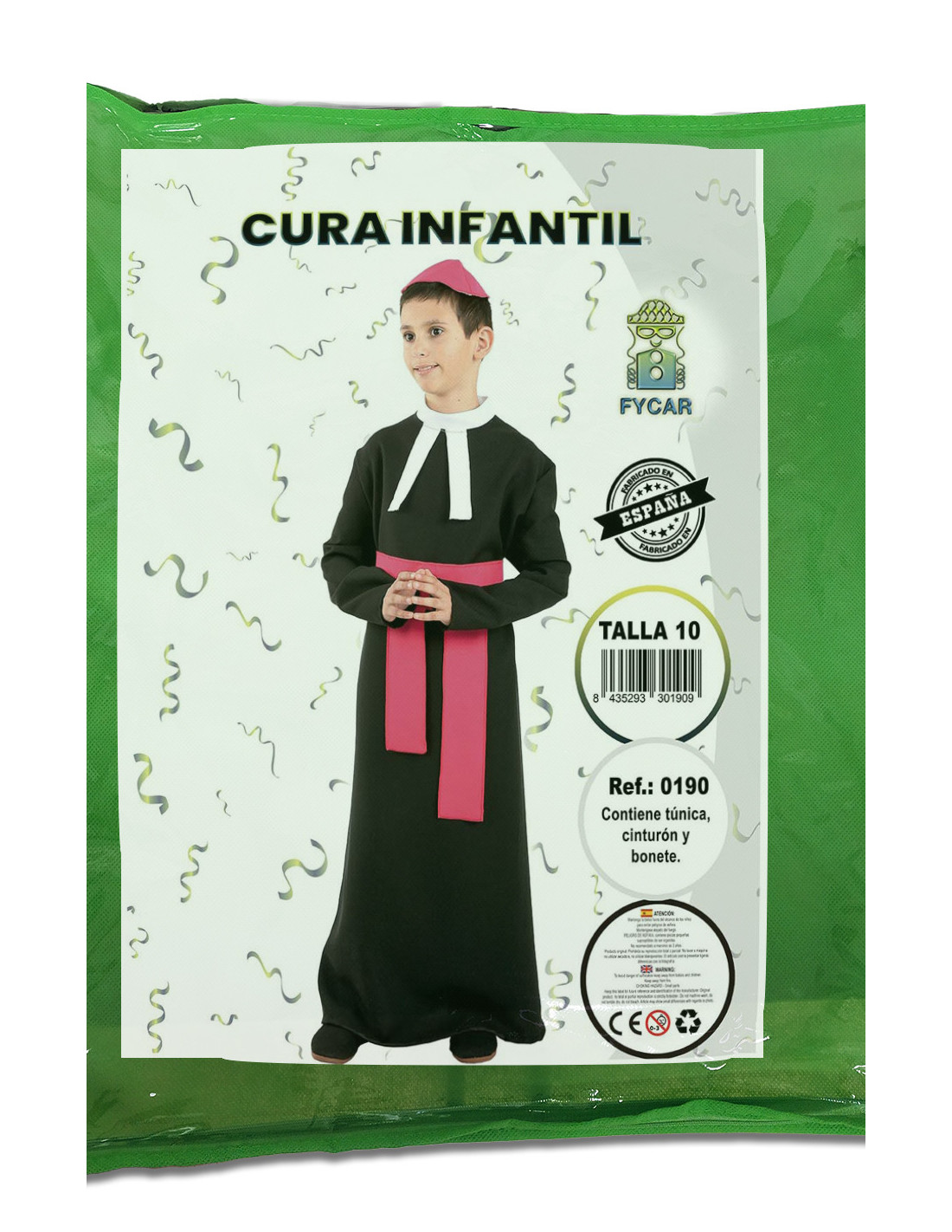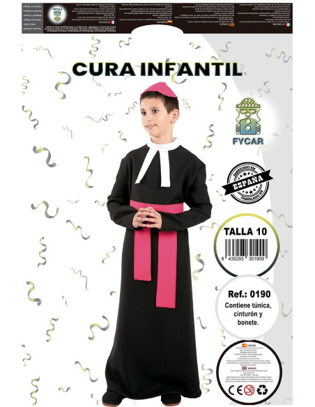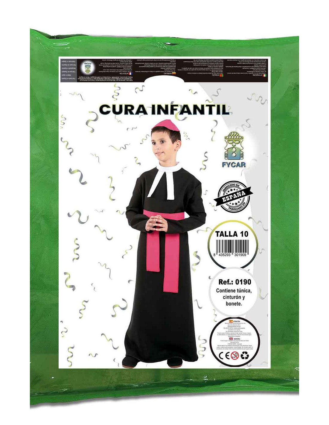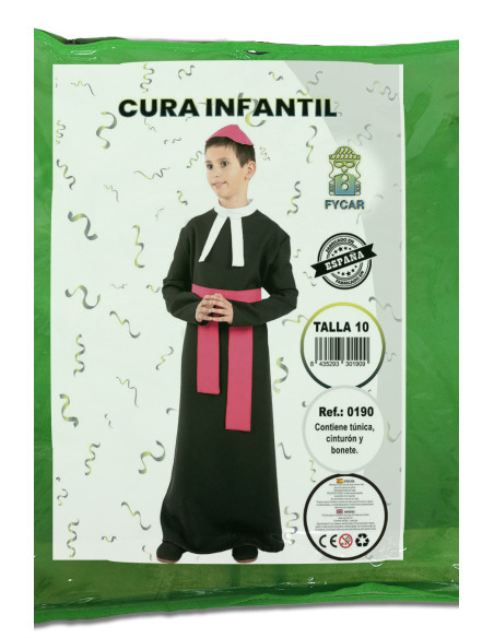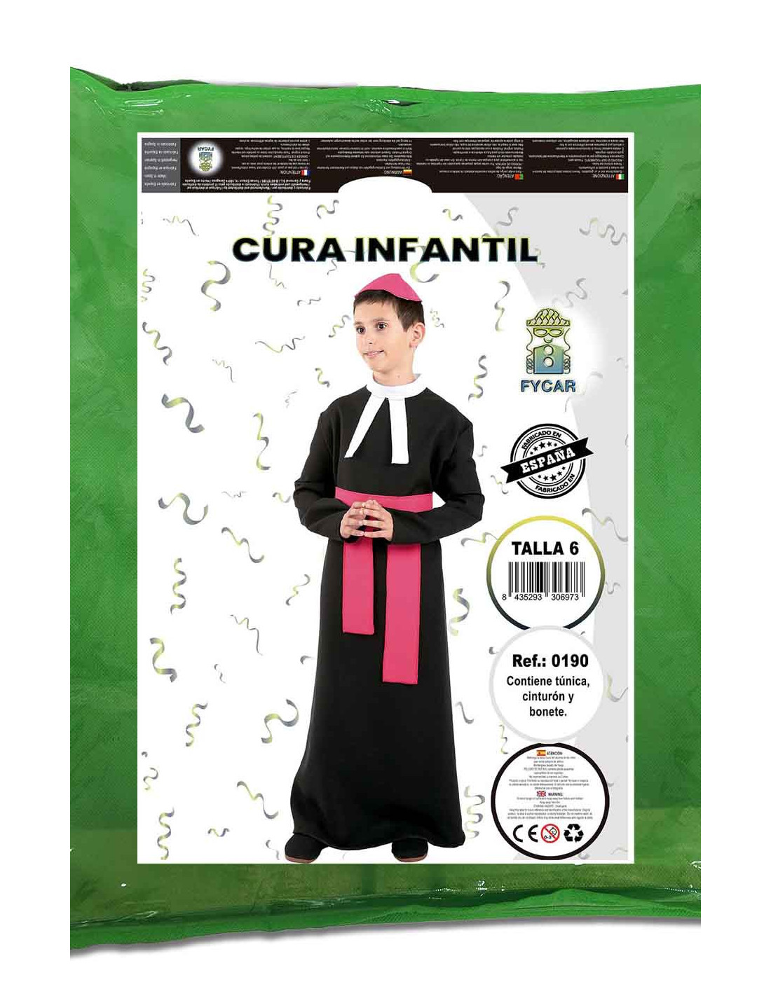 Disfra de cura para niño ideal para ferias medievales, Carnaval, Halloween o cualquier representación de fin de curso. Incluye disfraz de cura para niño, compuesto por una túnica negra, alzacuellos, cinturón y bonete fucsia. ¡Haz que confiesen sus travesuras!