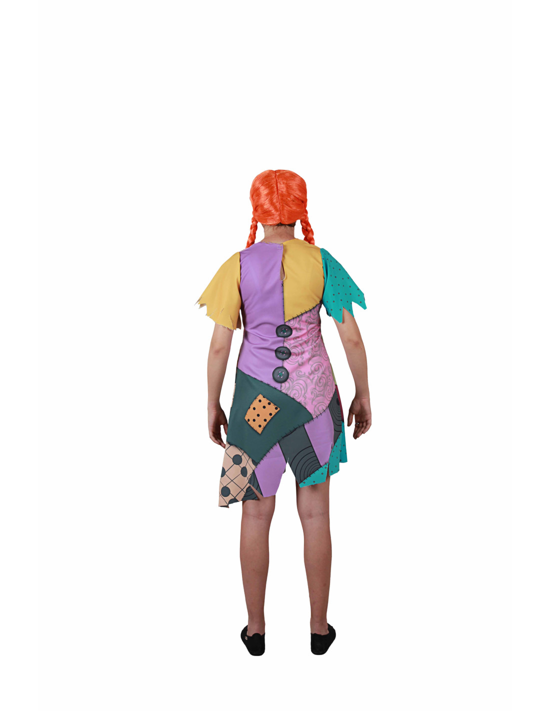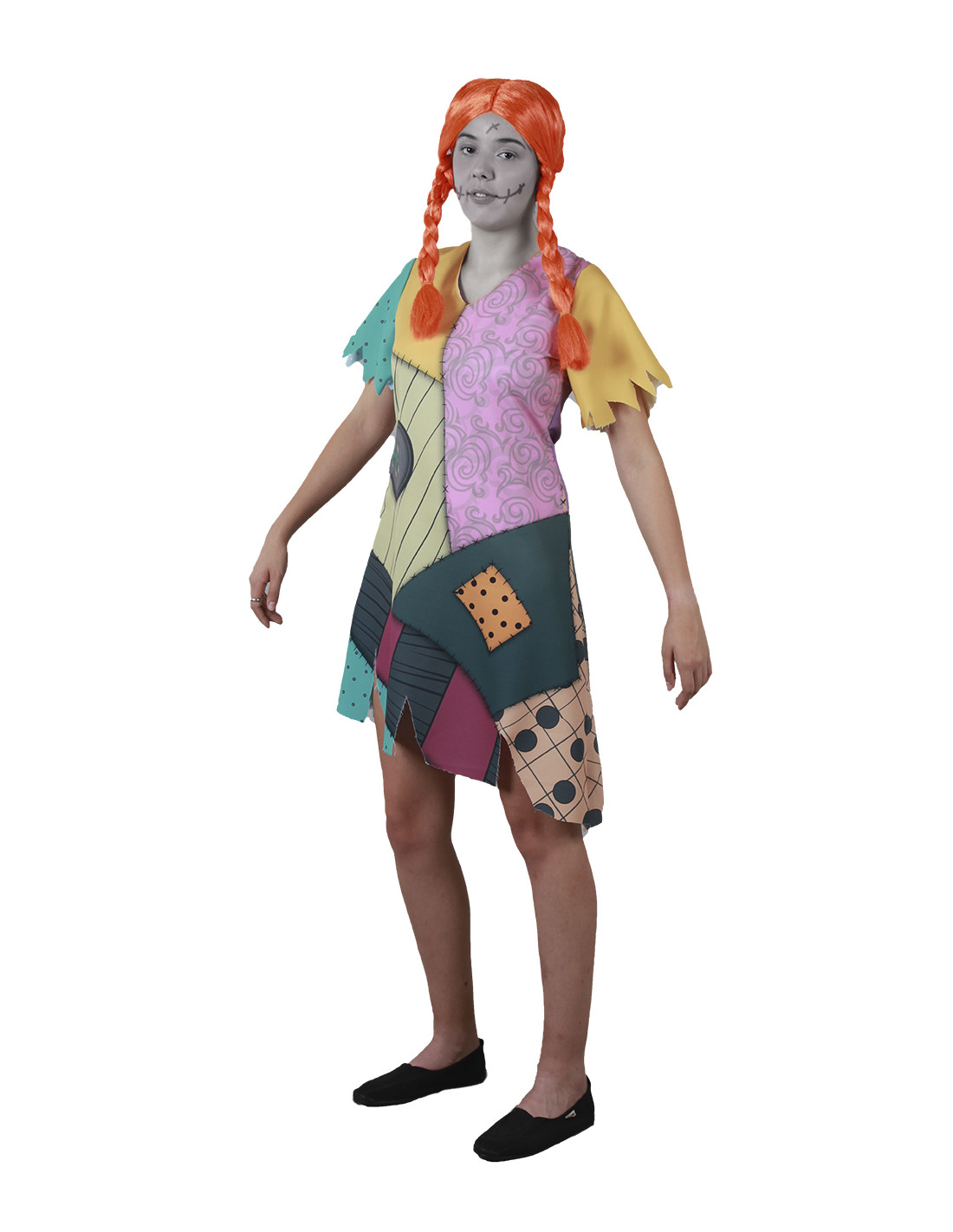 El disfraz de Sally contiene un colorido vestido de manga corta y falda desigual.