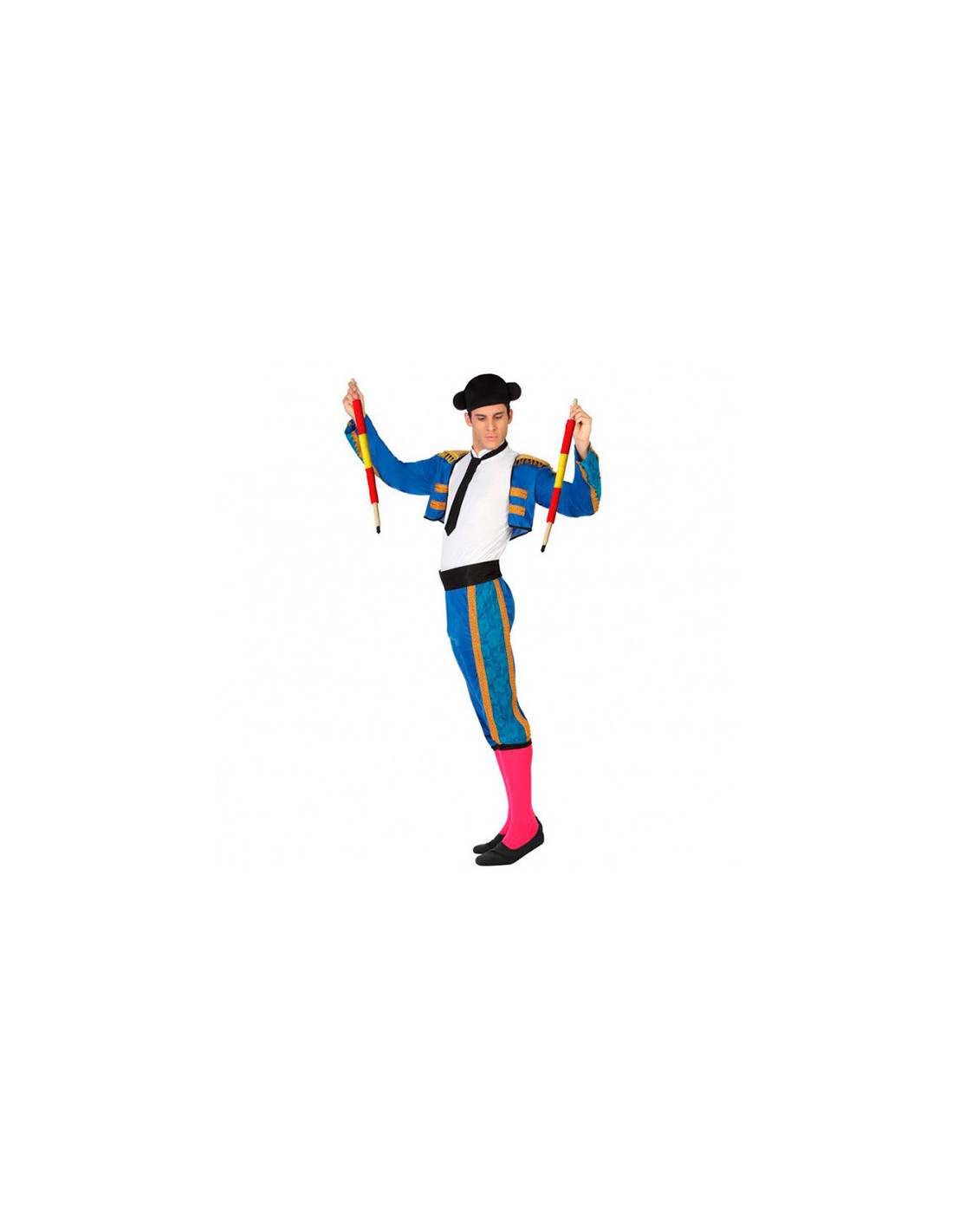 Disfraz de torero azul para hombre que incluye chaquetilla, camisa simulada, corbata, montera de fieltro, fajín y pantalones.