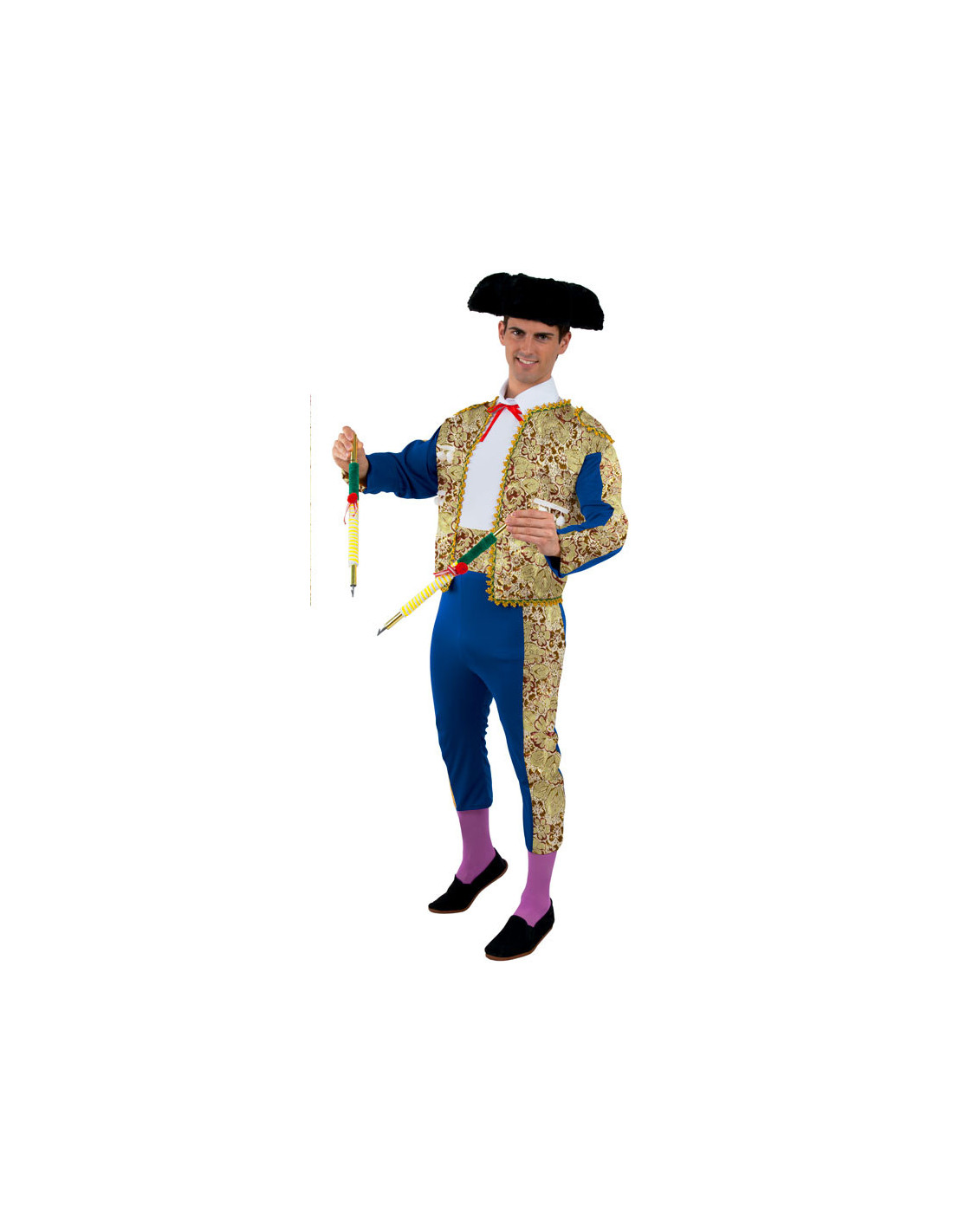 Disfrutarás entre chicuelinas y verónicas con este disfraz de torero para hombre. En tonos azules y dorados, este disfraz de torero para hombre está compuesto por chaqueta corta con borlas blancas, pechero con lazo en color rojo, fajín amarillo a juego con el traje, y pantalón.