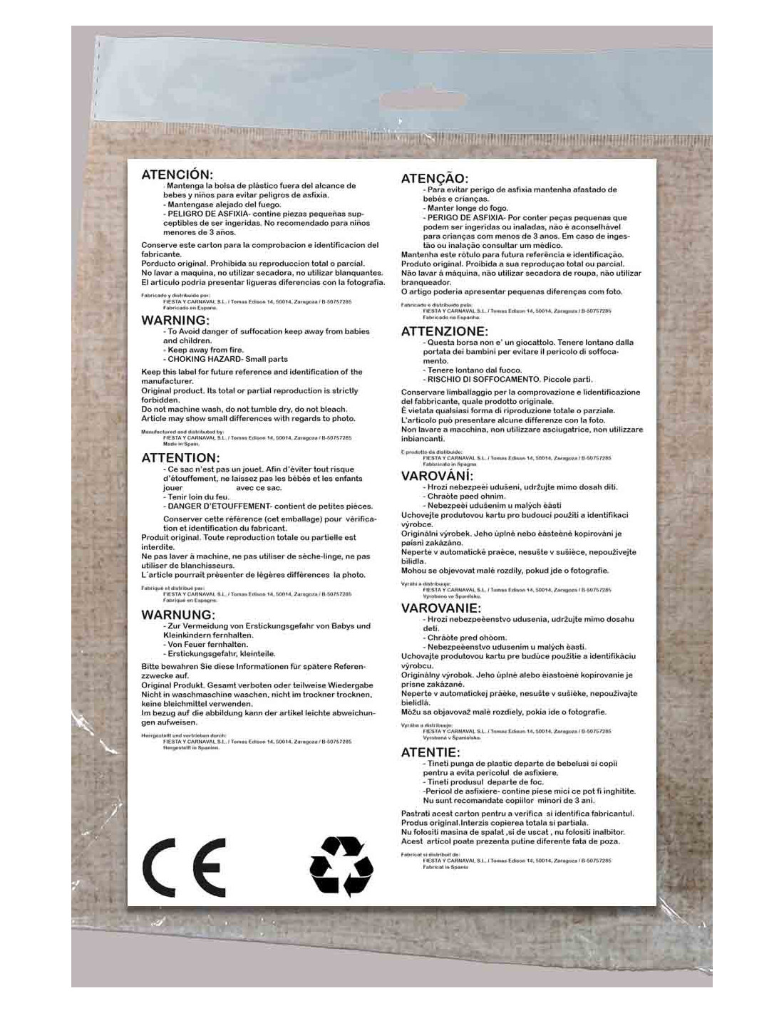 • Disfraz fabricado en tejidos de poliéster en un 80% y en otro tipo fibras un 20%.