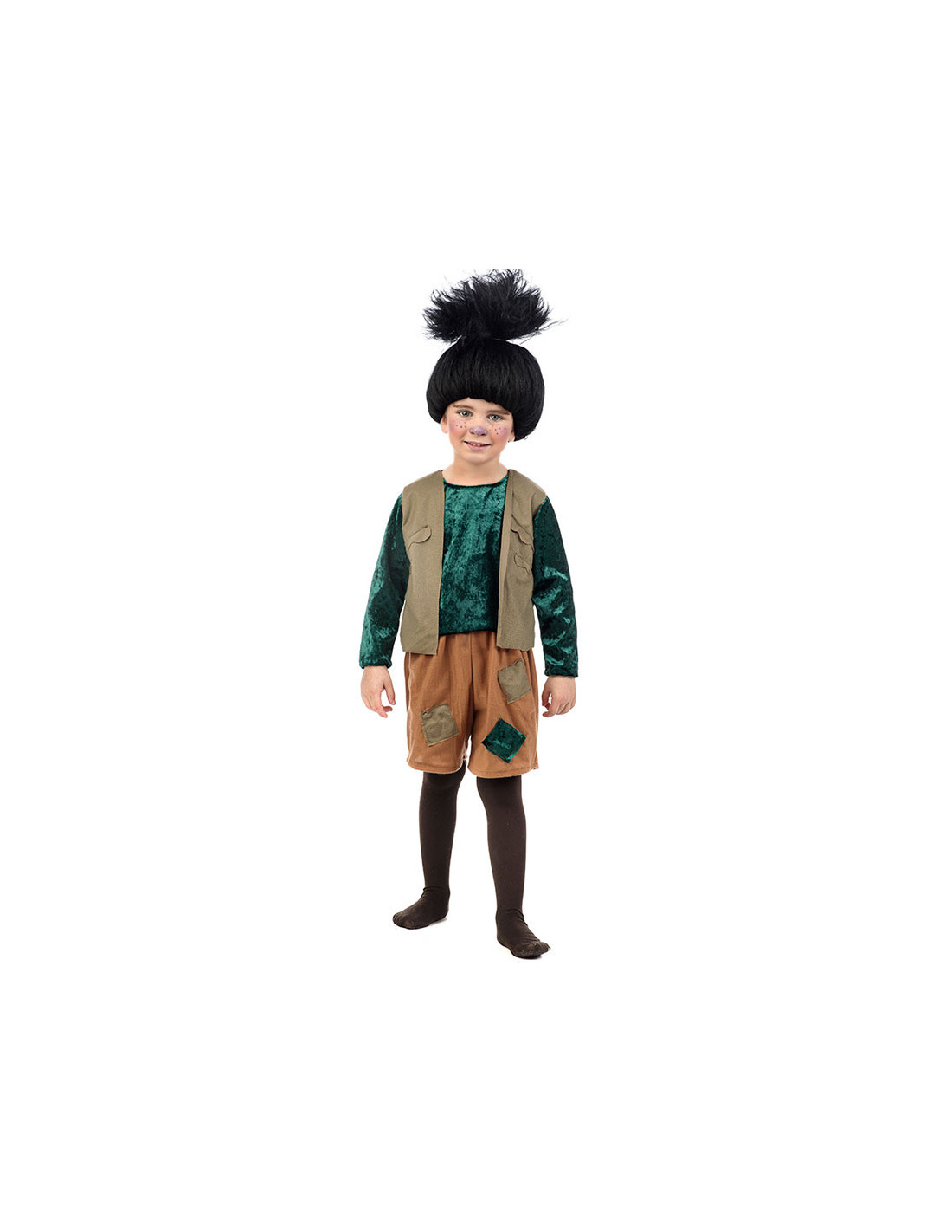 Disfraz de Troll para niño para que se convierta en todo un personaje fantástico. Compuesto por un vestido que simula chaleco en color verde oliva, camisa, pantalón marrón con rectángulos bordados que le dan el aspecto de roto, y medias y peluca negra alta como la que lucen los personajes de la película.