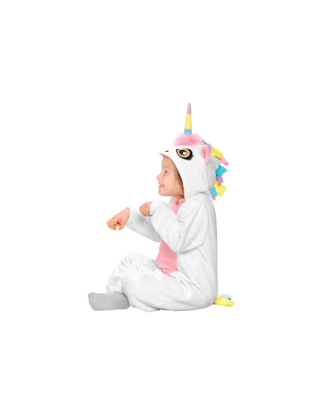 Este mágico disfraz de unicornio blanco infantil contiene un mono blanco y rosa de cuerpo entero. Además incluye una capucha con la cabeza de unicornio.