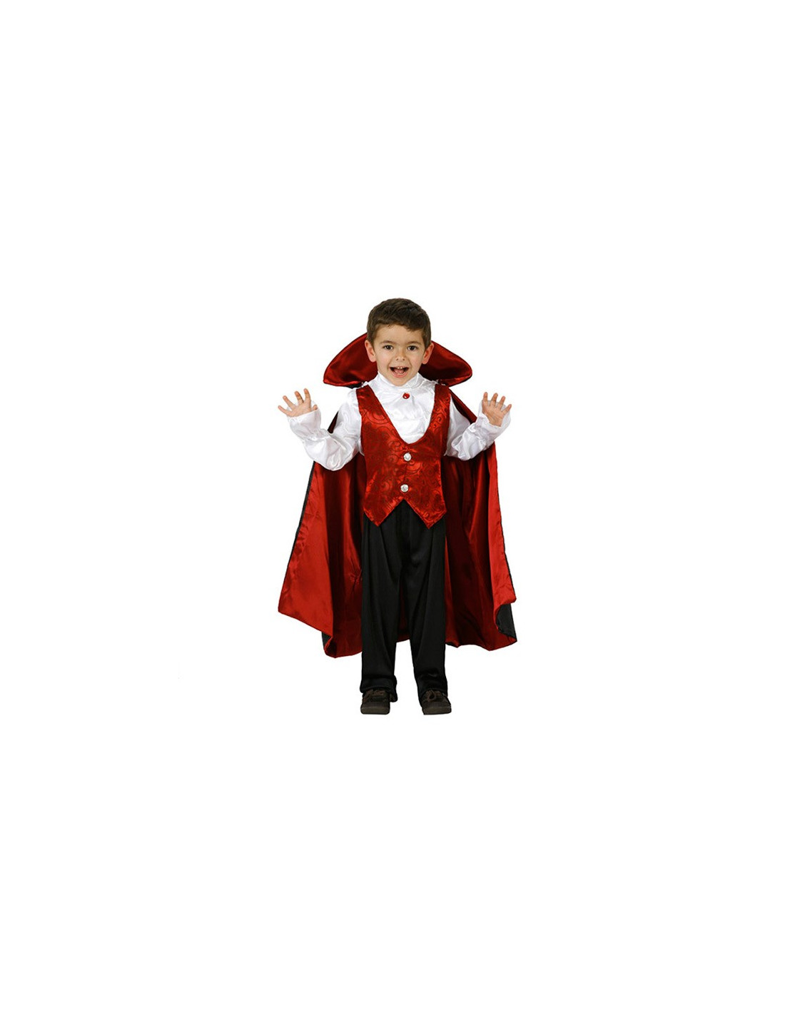El disfraz de vampiro elegante infantil contiene camisa blanca con chaleco rojo, pantalón negro y capa bicolor con cuello alto.