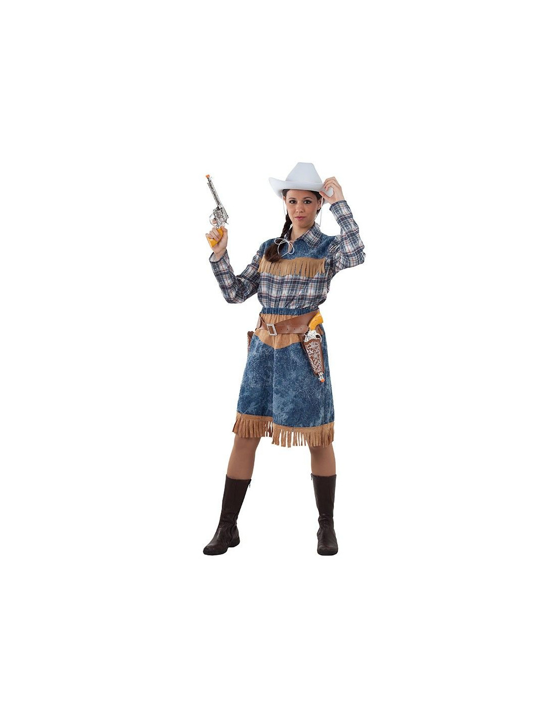 Disfraz de vaquera para mujer que incluye camisa a cuadros en tonos azules y flecos en la parte superior y falda con aspecto de tejido vaquero. No incluye sombrero, pistola ni cartuchera.