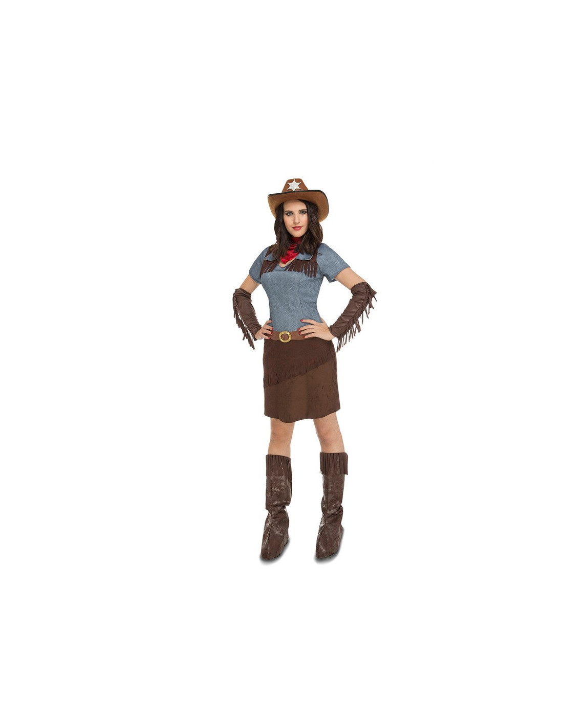Disfraz de vaquera pistolera para mujer que incluye vestido, pañuelo, cinturón, brazaletes y polainas.