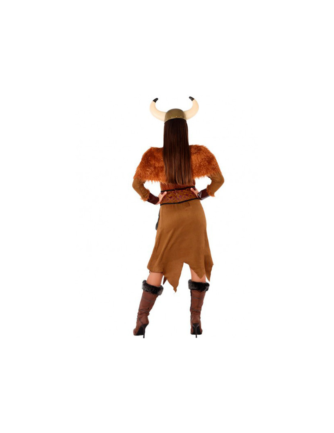 Disfraz de vikinga salvaje para mujer que incluye un vestido con una tira, cinturón y mini capa de pelo.