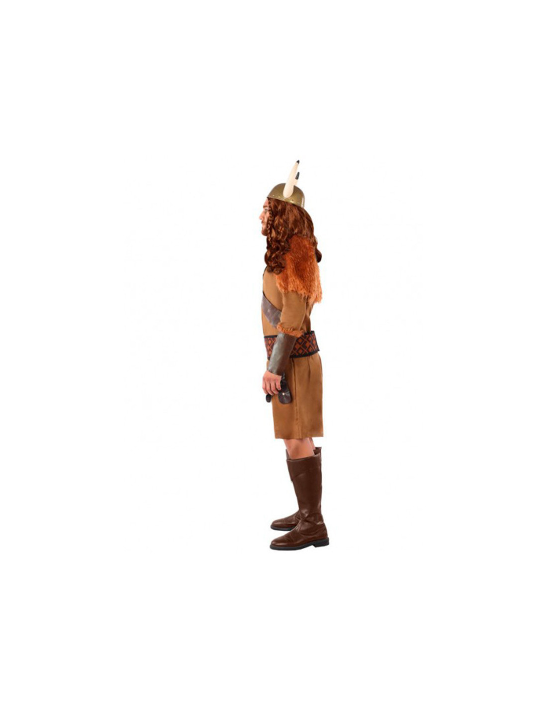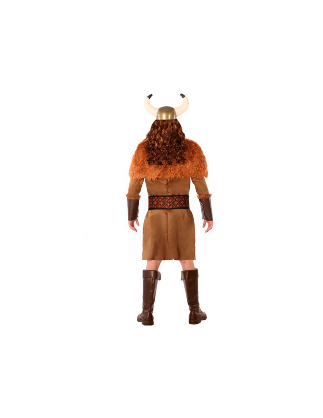 El disfraz de vikingo salvaje para hombre contiene una túnica marrón con tiras en el pecho, muñequeras unidas a la túnica, cinturón con calavera vikinga impresa y capa cubre hombros de pelo.