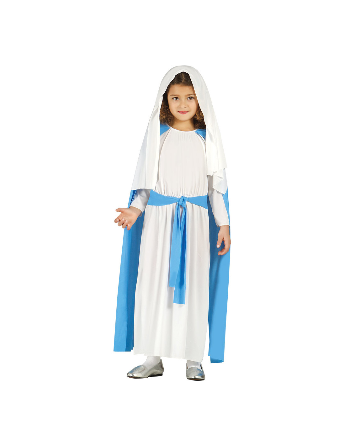 Disfraz de Vírgen María infantil que incluye tocado, túnica con capa y cinturón.