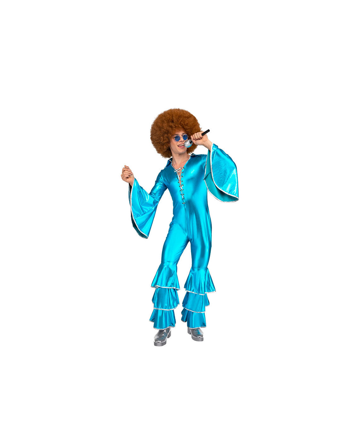 Disfraz Disco azul para hombre que incluye un mono de cuerpo entero.
