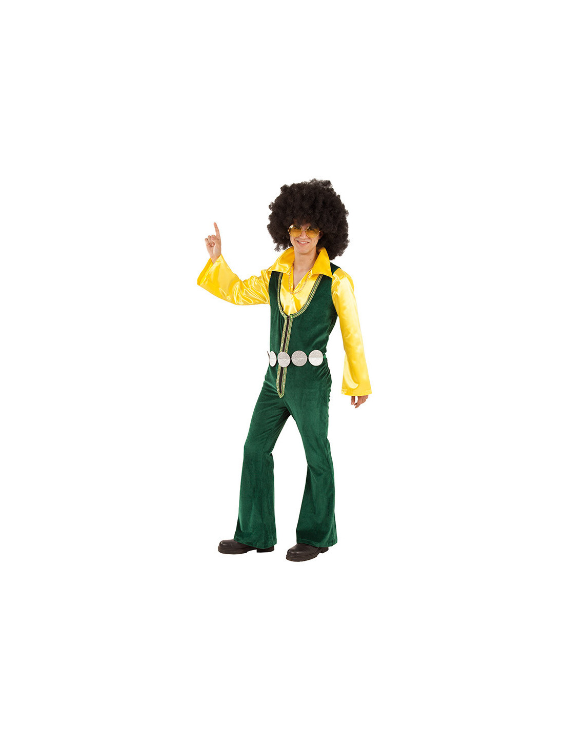 Este disfraz disco hombre contiene una camisa amarilla con mangas acampanadas, mono verde y cinturón.