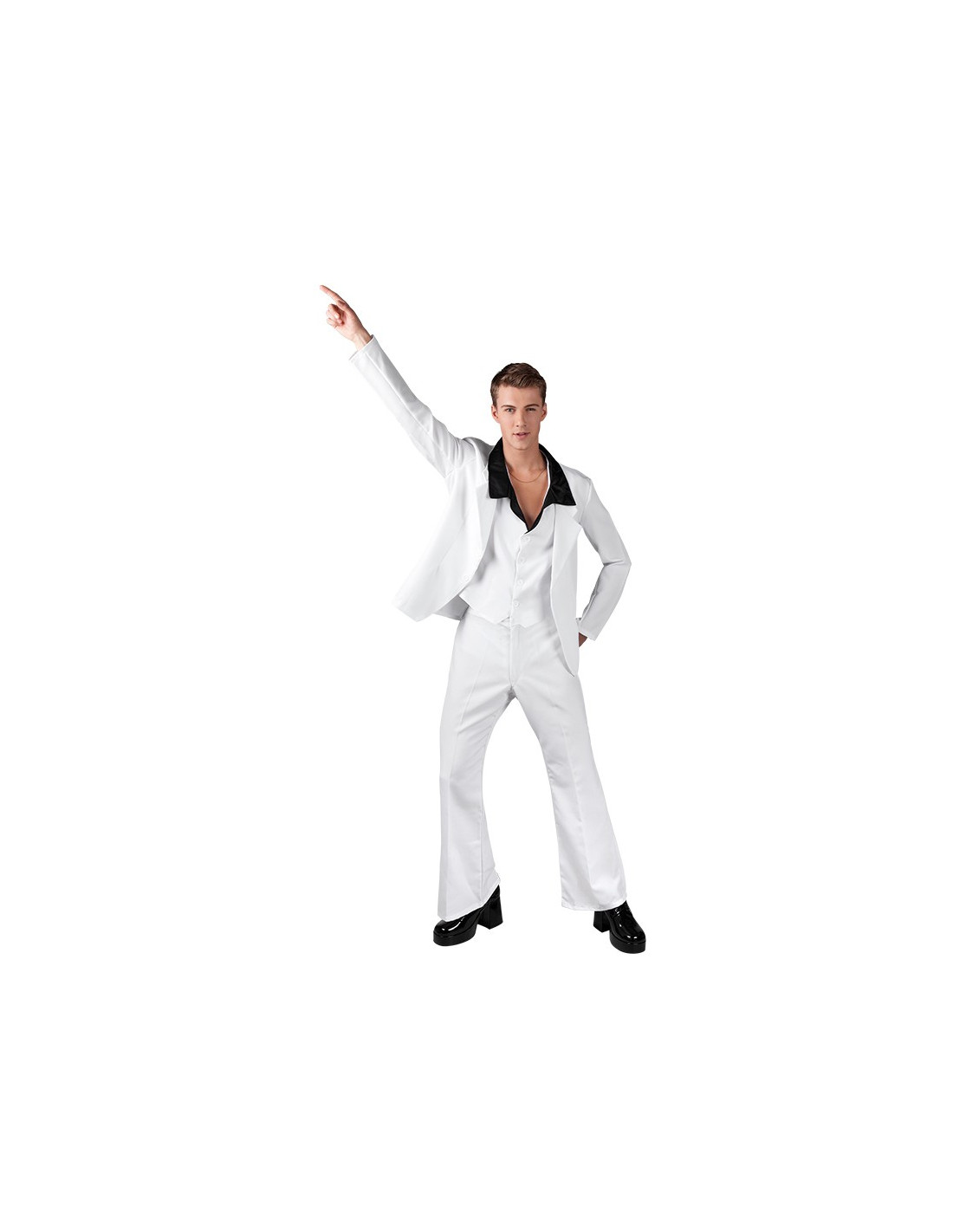 El disfraz disco para hombre incluye una camisa blanca con cuelo negro, chaqueta blanca y pantalón blanco acampanado.