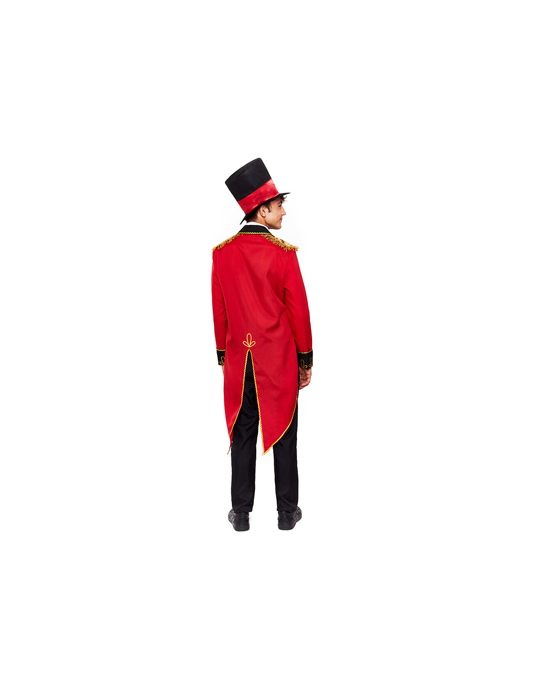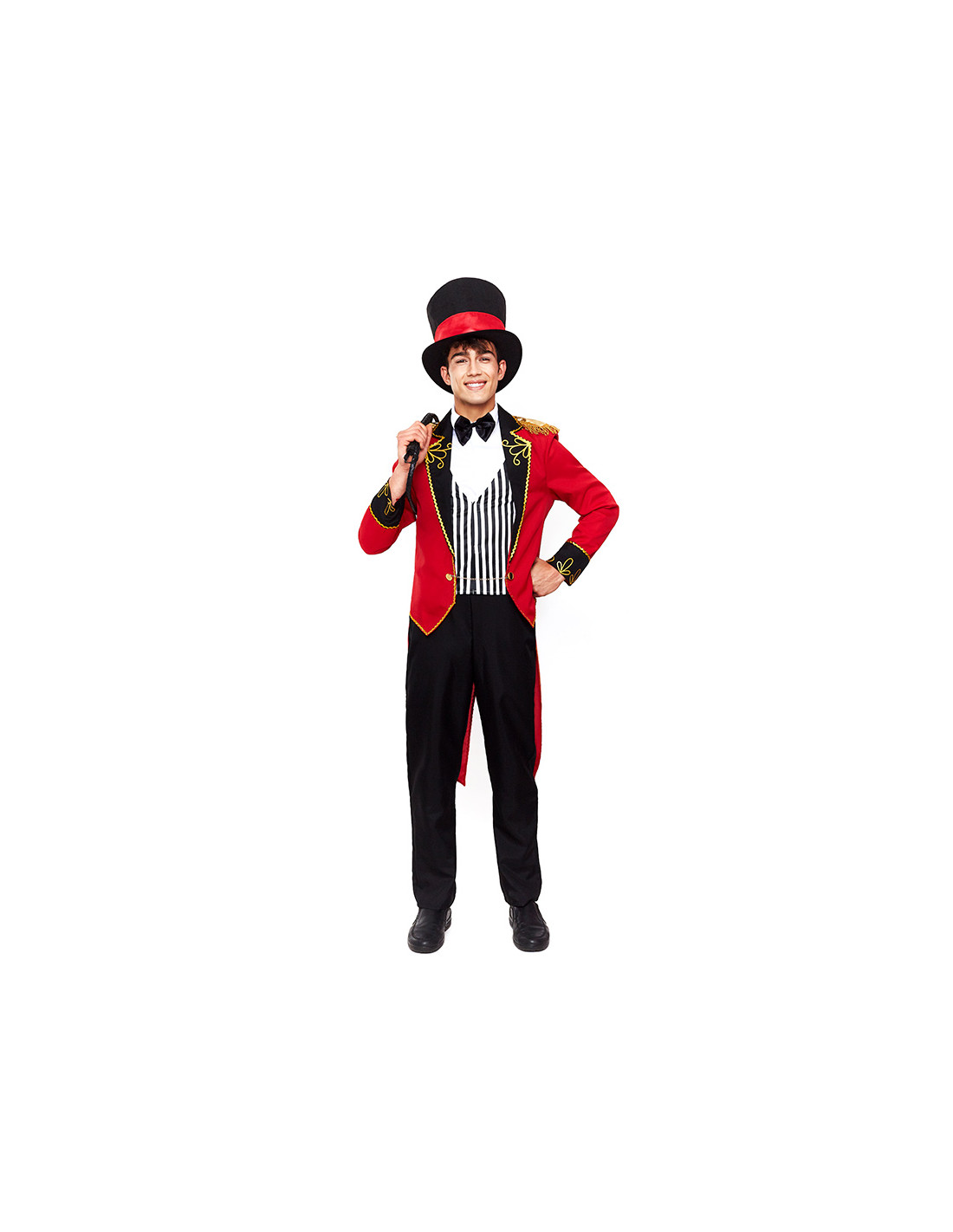 Disfraz de domador o presentador de circo para hombre, este disfraz lleva incluido chaqueta, pantalón, sombrero y pajarita. No incluye látigo.