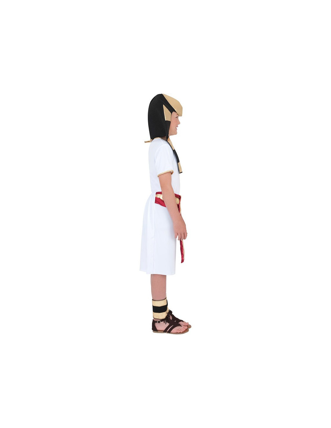 Disfraz egipcio para niño que incluye toga, cinturón, pieza para la cabeza y tobilleras.