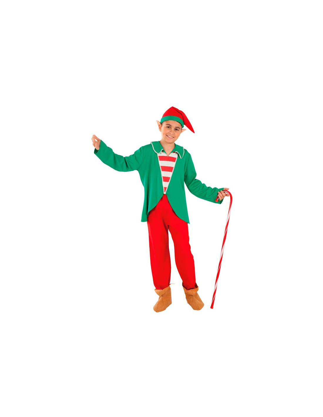 Disfraz Elfo de la Navidad para niño que incluye gorro, casaca, pantalón y cubrebotas.