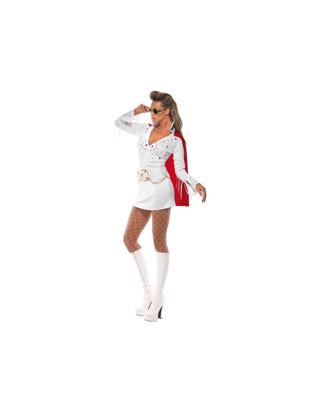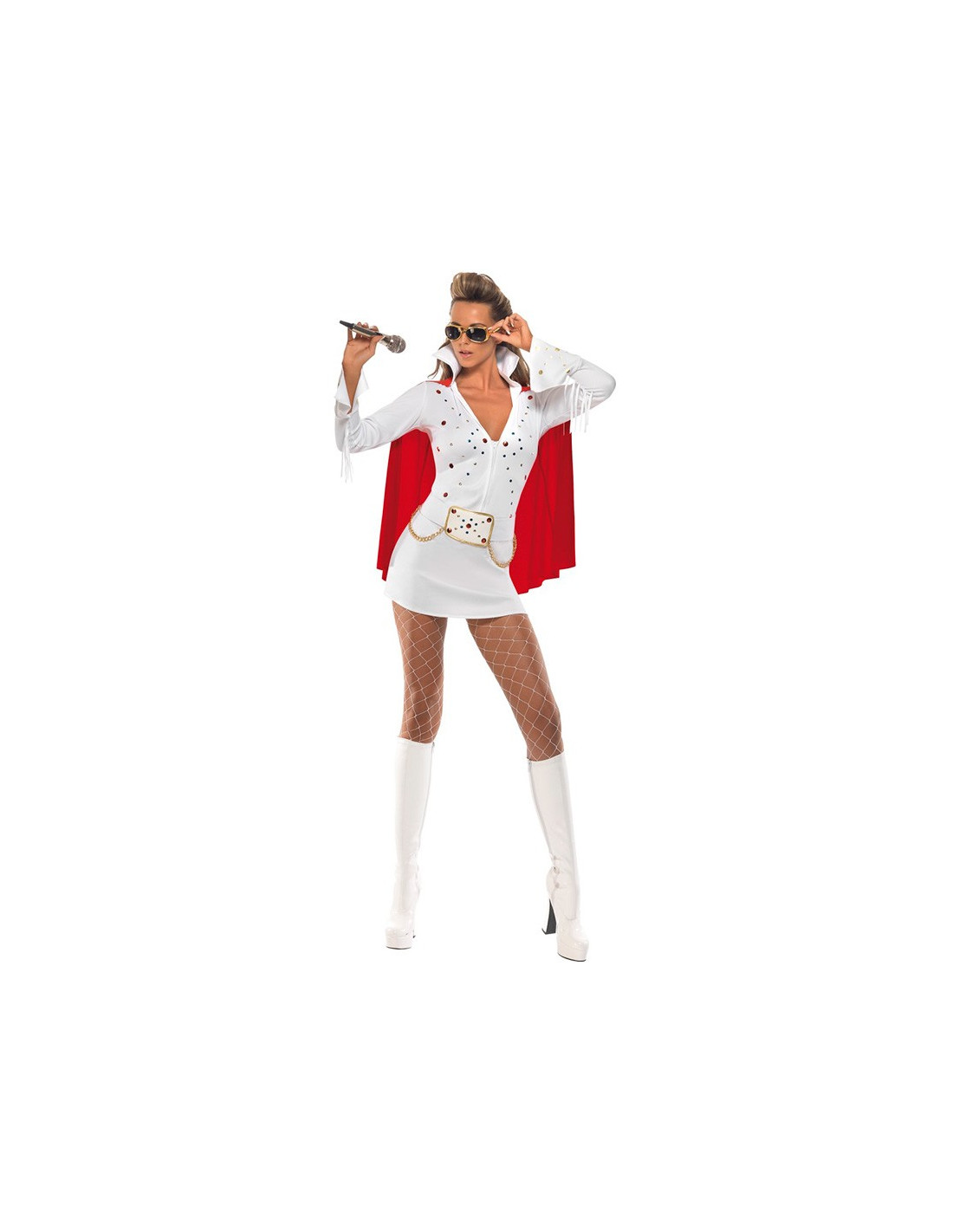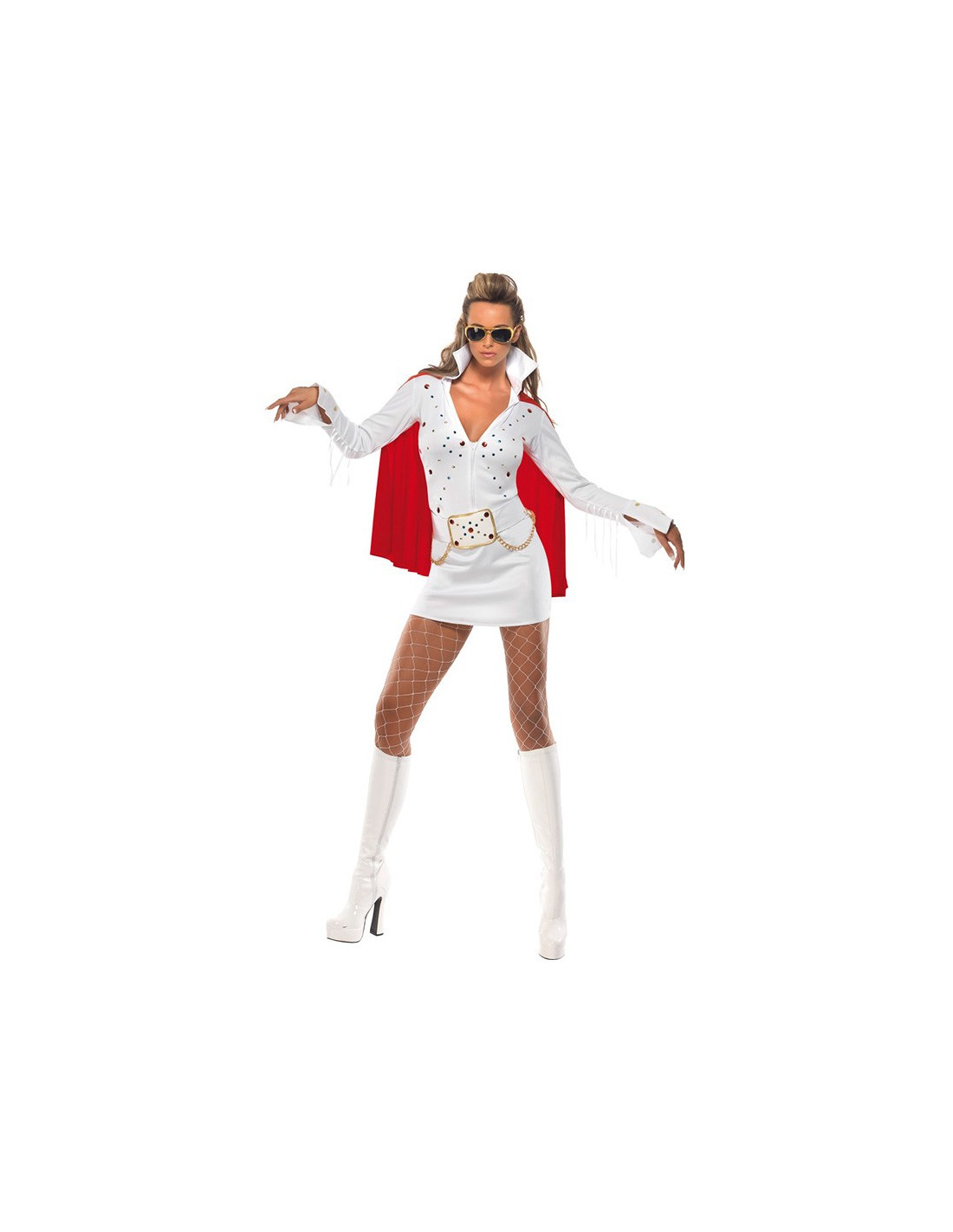 Este disfraz Elvis sexy para mujer incluye un vestido blanco ajustado con decoraciones y una capa roja.