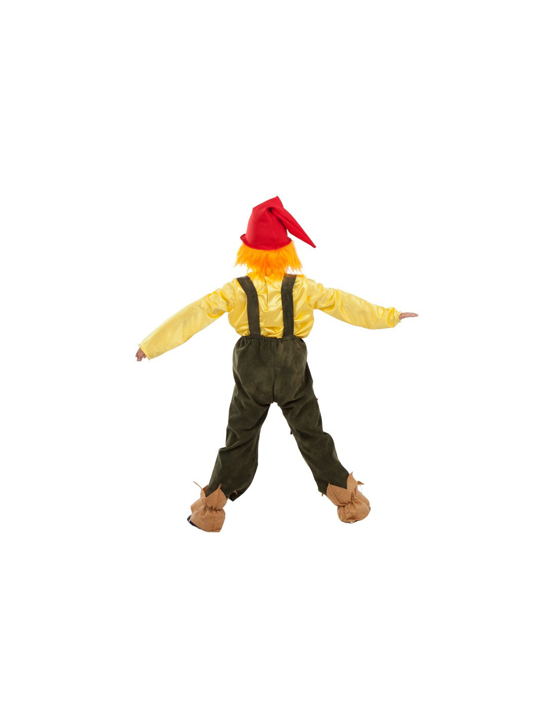 El disfraz enanito para niño contiene gorro con pelo naranja, camisa amarilla con barba naranja, peto con tirantes y cubrepies.