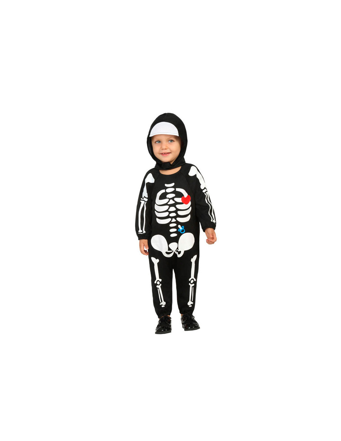 Disfraz esqueleto para bebé que contiene un mono de cuerpo entero y un gorro a modo de capucha.
