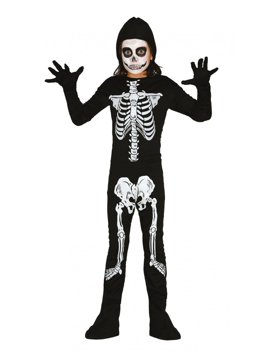 Disfraz esqueleto siniestro infantil que incluye mono y capucha.