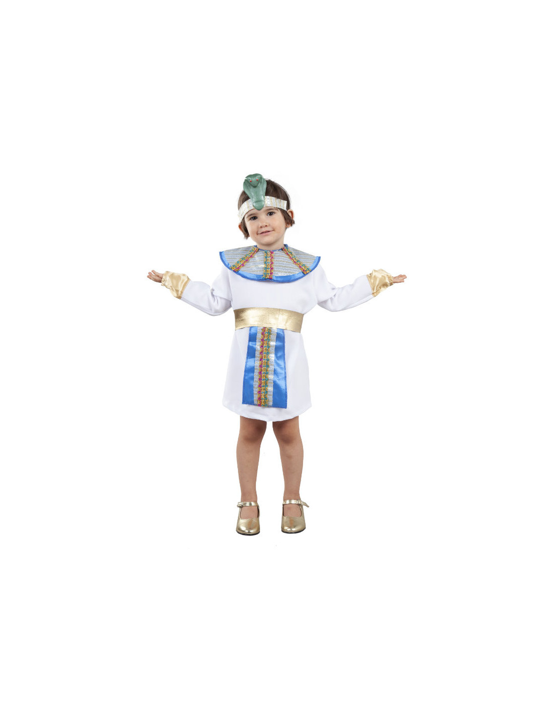 El disfraz faraona egipcia bebé contiene un vestido blanco de manga larga, un cuello en tonos metalizados con un cinturón a juego y un tocado con una serpiente.