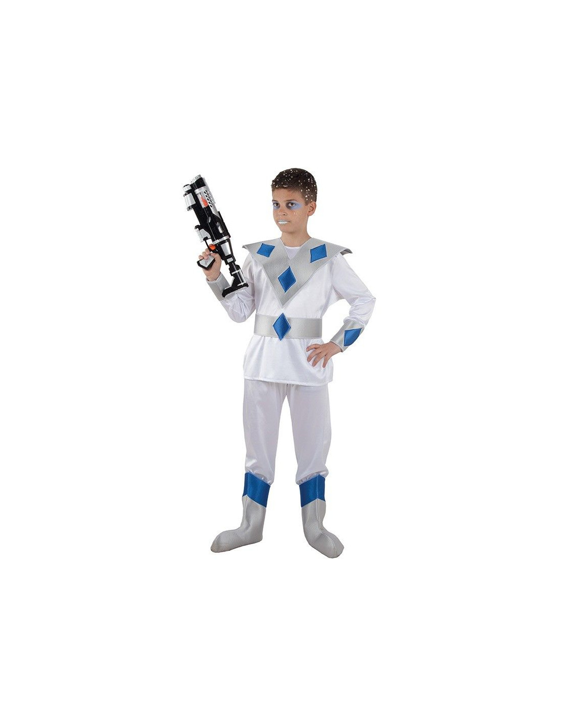 Disfraz galáctico niño formado por camisa decorada con cubre hombros de foam y rombos, muñequeras a juego, cinturón, pantalón y cubrebotas también de foam.